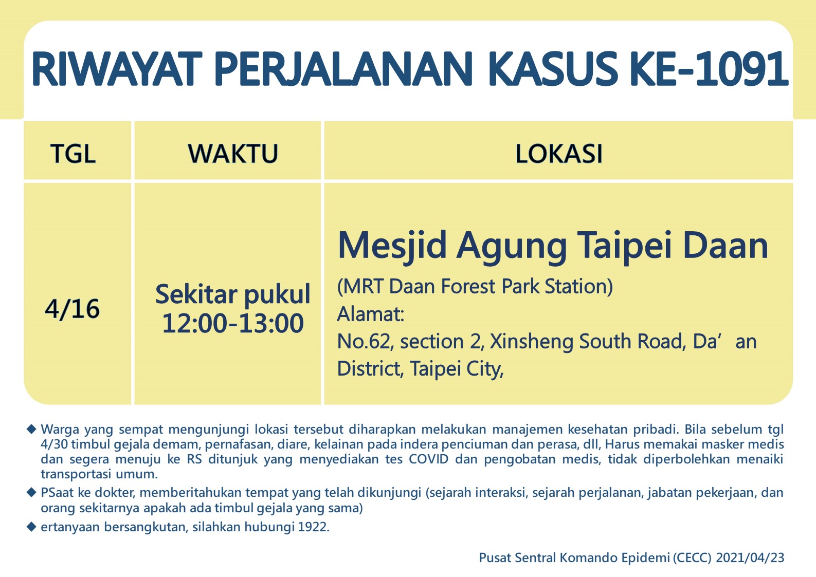 Case #1091 is an Indonesian male in his 50s who is a colleague of the pilot. Case #1091 was on duty in the United States from April 4 to April 10, and was asymptomatic during the period. After returning to Taiwan, he was tested on April 15 after completing the quarantine period; the test result came back negative. He experienced tiredness and felt slightly hot on April 16. He visited the Taipei Grand Mosque with the pilot and Case #1090 at noon the same day. He experienced a mild cough on April 18. His symptoms improved after he took some medicines. As he planned to visit his relatives in Indonesia, he took a self-paid test on April 21; infection with COVID-19 was laboratory-confirmed in the case on April 23 (the CT value was 27).