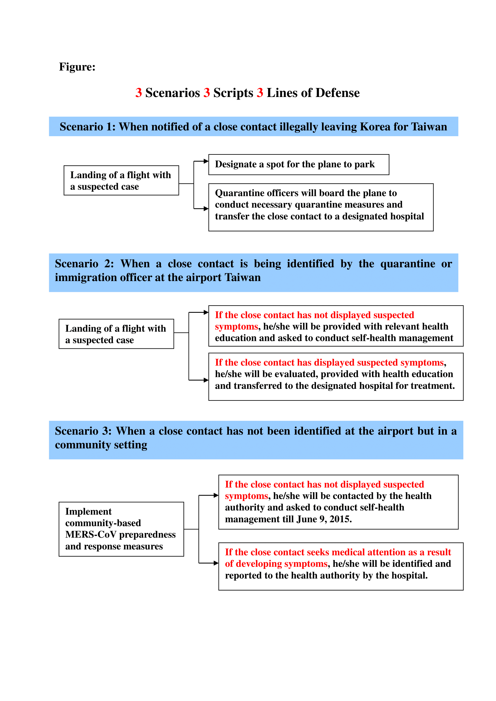 Taiwan CDC stated that the suspectedcase flew to Hong Kong from South Koreaon May 26 and then took a bus to Shenzhen from Hong Kong.As of May 29, Taiwan CDC has obtained the list of 166 passengers on the sameflight. If the suspected case is confirmed to have contracted MERS-CoV, TaiwanCDC will provide the list of passengers to the National Immigration Agency andwill implement preparedness and response measures outlined in the 3 scenariosand 3 scripts the agency planned for potential importation of a MERS-CoV case(Please see attached figure).