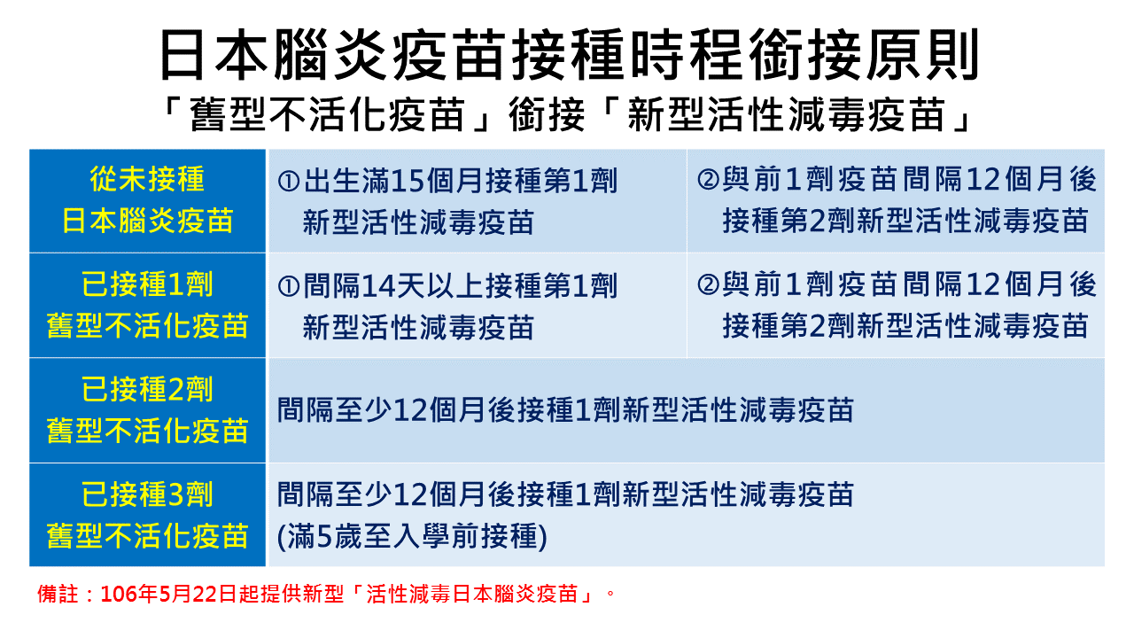 疾管署表示,新型活性減毒日本腦炎疫苗接種時程為出生滿15個月接種第1劑,間隔12個月接種第2劑。另針對先前已按時程接種不活化日本腦炎疫苗的幼童,疾管署依據傳染病防治諮詢會預防接種組(ACIP)會議建議,訂定下列疫苗銜接原則,以達到疫苗完整保護力: