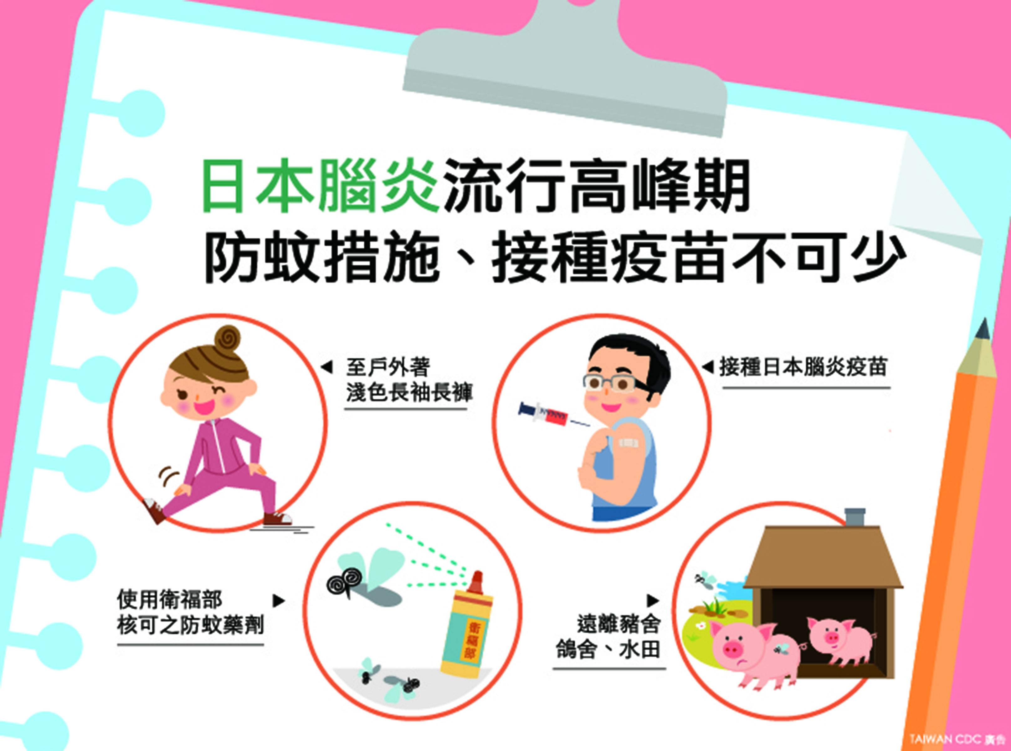國內傳播日本腦炎病媒蚊以三斑家蚊為主,常孳生於水稻田、池塘及灌溉溝渠等處,吸血高峰為黃昏與黎明時段,請民眾儘量避免於病媒蚊吸血高峰時段,在豬舍、其他動物畜舍或病媒蚊孳生地點等高風險環境附近活動;如果無法避免,應穿著淺色長袖衣褲,並於身體裸露處使用政府機關核可的防蚊藥劑,避免被病媒蚊叮咬而感染。相關資訊可至疾管署全球資訊網(https://www.cdc.gov.tw)或撥打免付費防疫專線1922(或0800-001922)洽詢。