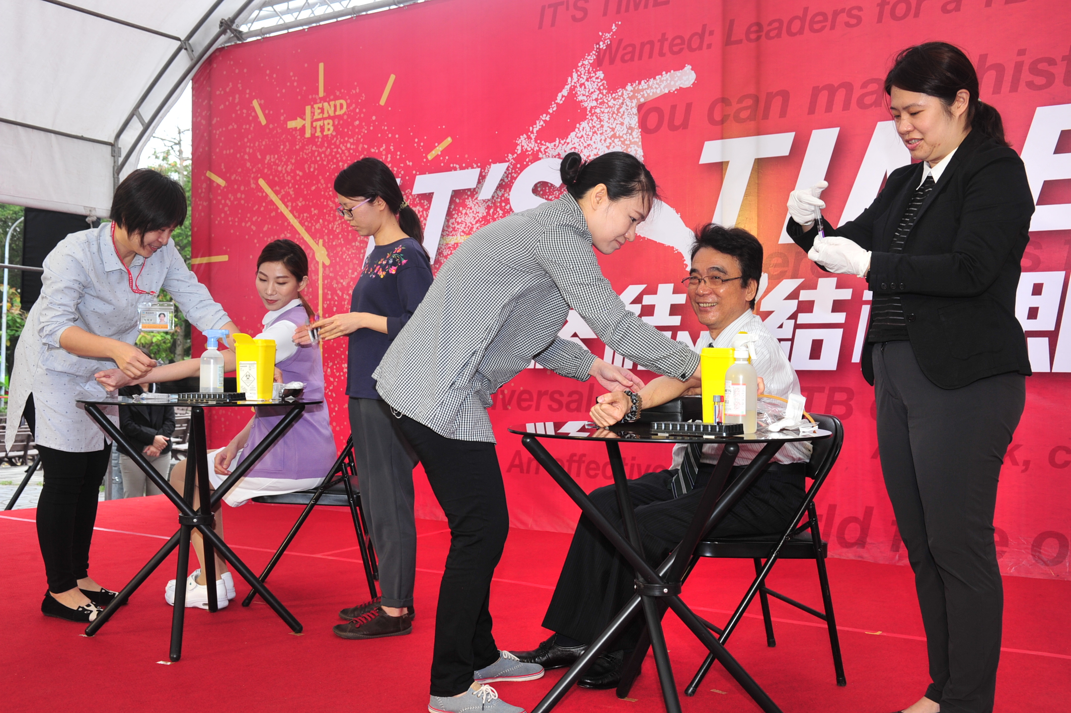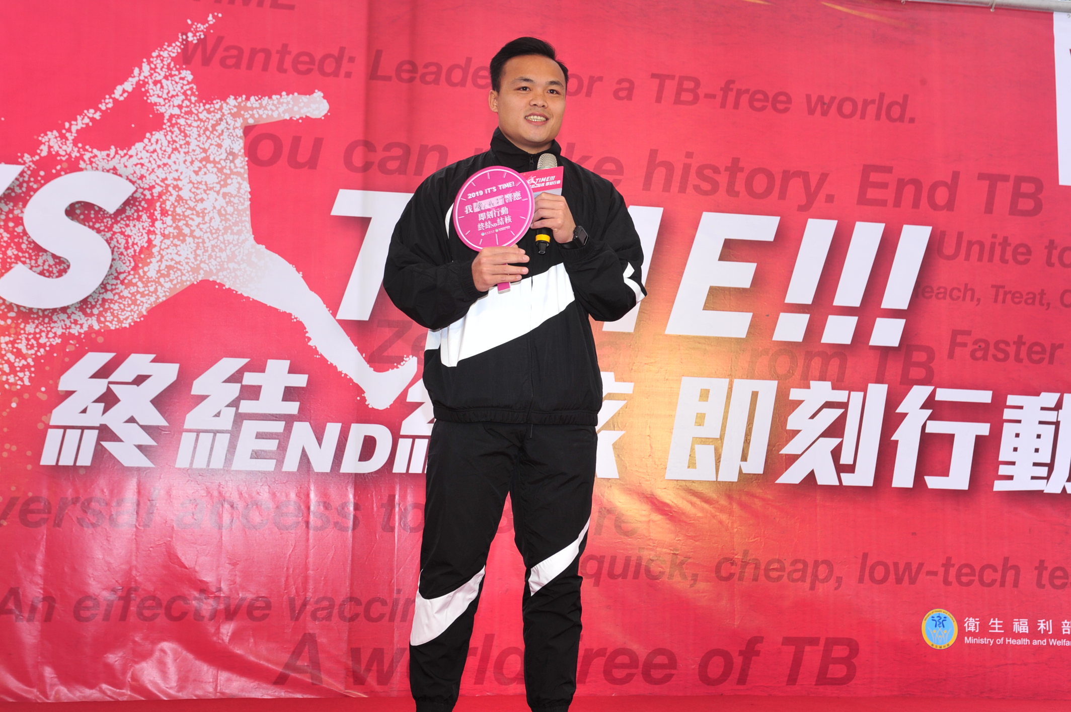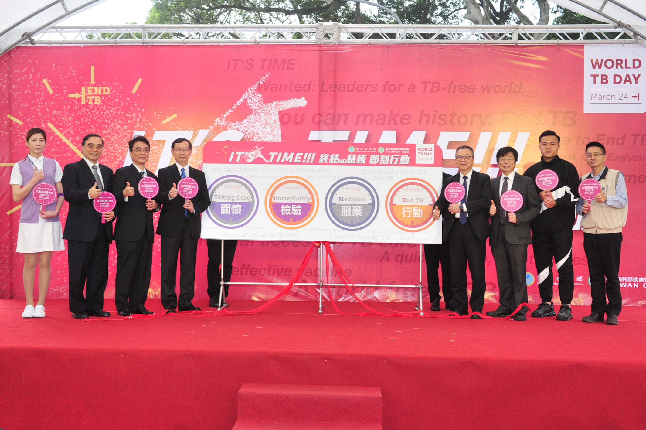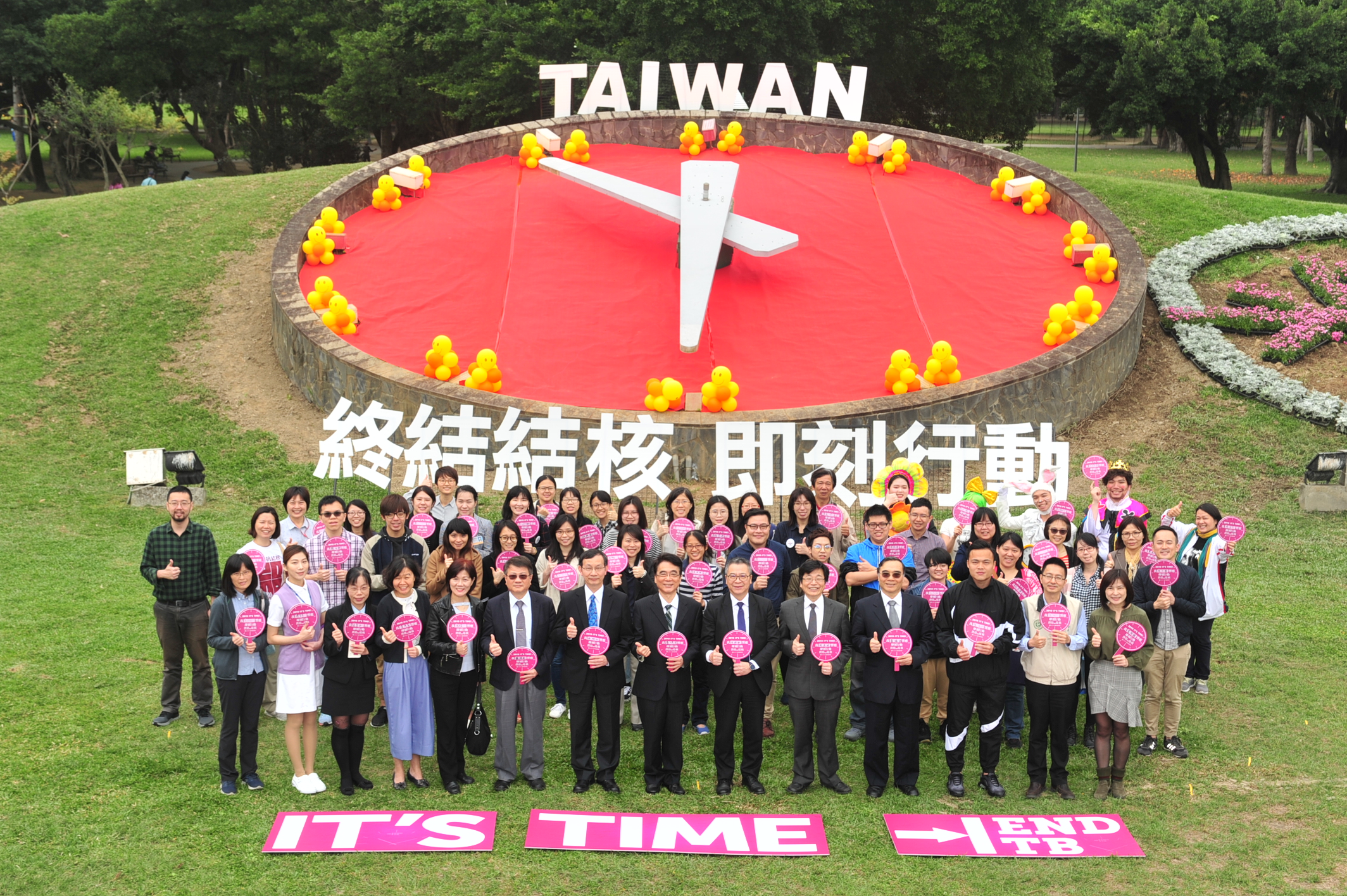 為響應今(2019)年世界結核病日宣導主題「IT’S TIME」,疾病管制署今(3月22日)假臺北市青年公園舉辦「終結結核 即刻行動」活動,以「花鐘」結合主題,展現結核病防治工作刻不容緩及消滅結核病的決心。今日出席活動的代表包括衛生福利部何啟功次長、疾病管制署周志浩署長、結核病防治諮詢委員、民間團體,及邀請世大運標槍金牌選手鄭兆村代言,並安排官方、專業學會、醫事人員代表帶頭現場接受潛伏結核感染檢驗,共同呼籲可能的潛伏感染者接受檢驗及治療避免發病,同時喚起民眾對結核病防治的重視。