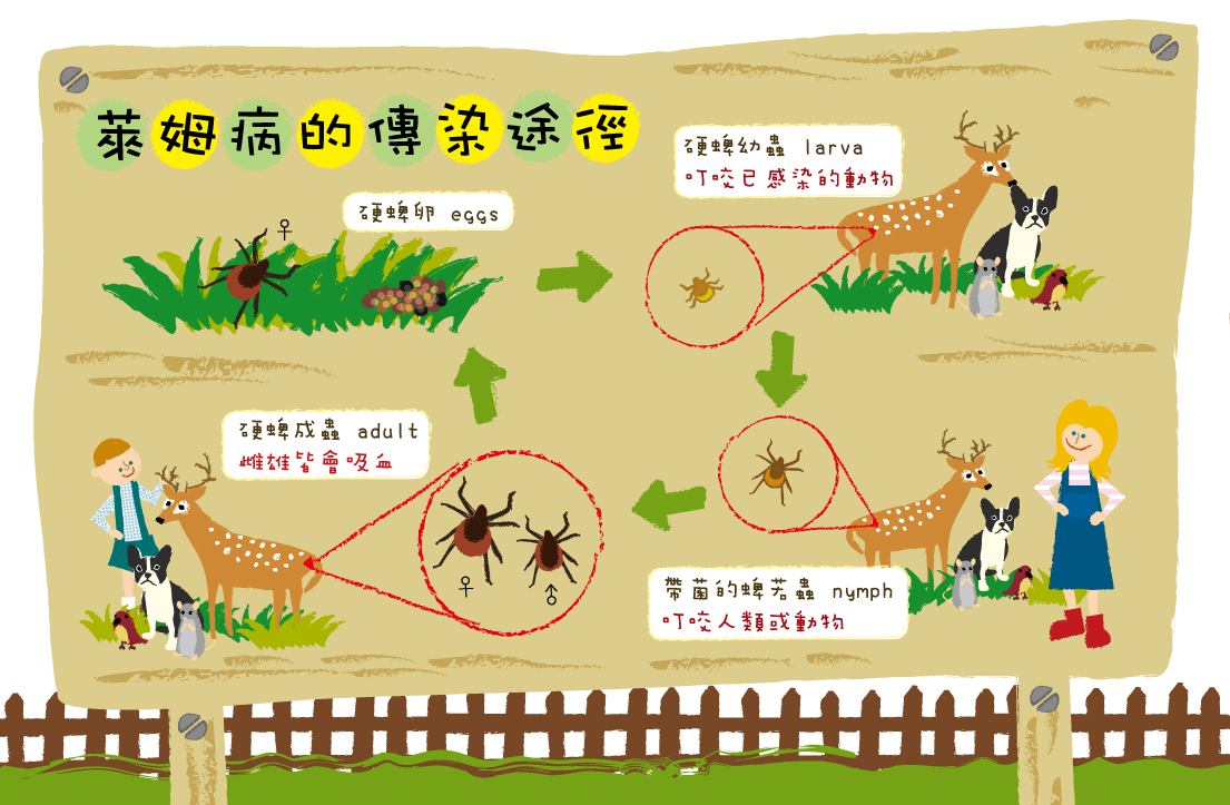 萊姆病是一種藉由被感染的蜱(俗稱壁蝨)叮咬而傳播的人畜共通傳染病,不會人傳人,在自然界中,蜱主要寄生在野外的鼠類身上,人類會因為被感染的蜱叮咬而遭到感染。萊姆病潛伏期為3至32 天(平均7至10天),70%至80%感染者會出現遊走性紅斑,感染初期會有頭痛、發燒、淋巴腺腫大、肌肉疼痛、喉嚨痛、頸部僵硬等類似感冒的症狀,若沒經過妥適治療,後期可能會出現心臟或神經系統異常。