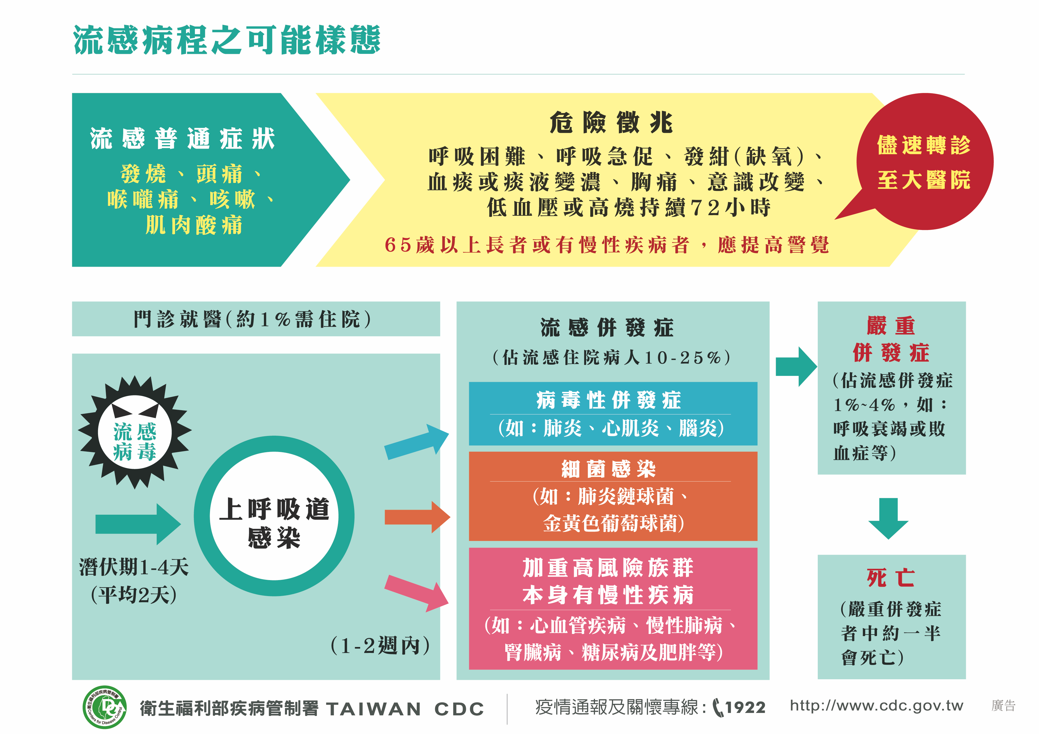 流感病毒主要透過飛沫傳播造成上呼吸道感染,潛伏期1至4天(平均約2天),主要症狀為發燒、頭痛、肌肉痛、疲倦、流鼻涕、喉嚨痛及咳嗽等,大多數患者經就醫服藥、休養後會自行痊癒,但65歲以上長者或具慢性疾病者為流感重症高危險群,應特別留意個人健康情形,一旦出現前述流感危險徵兆務必儘速至大醫院,以免引發重症或死亡。