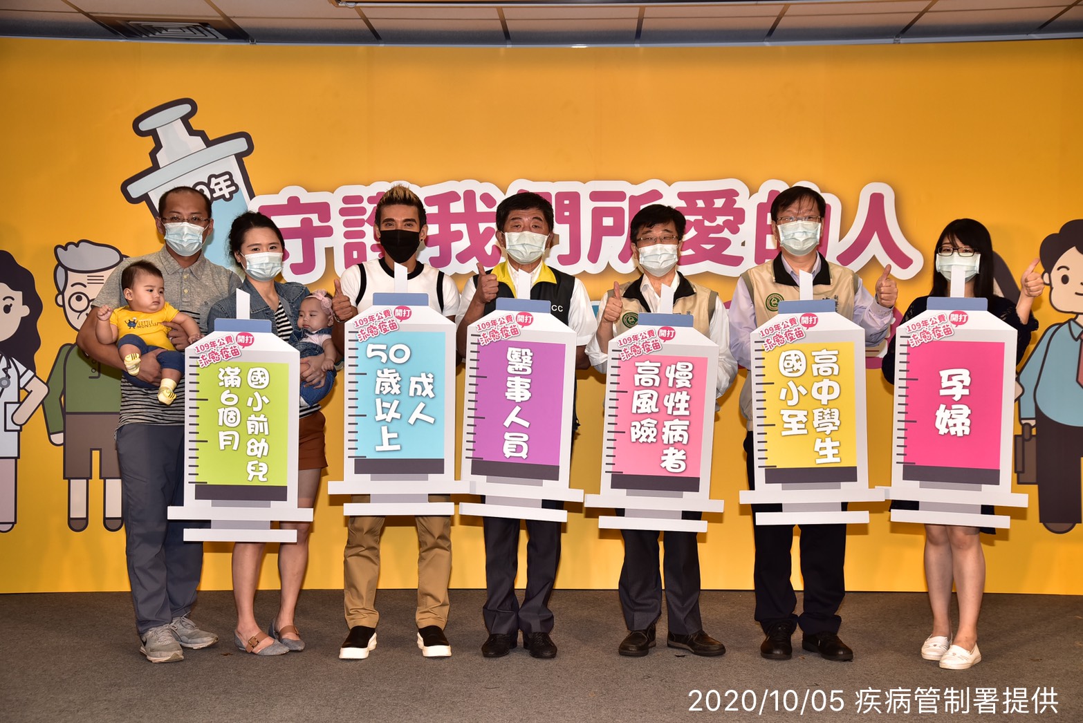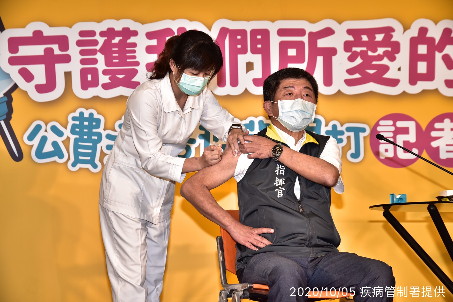 疾管署今日舉辦「守護我們所愛的人」公費流感疫苗開打記者會,邀請衛生福利部陳時中部長、疾病管制署周志浩署長、疾病管制署莊人祥副署長、防疫大使潘若迪及雙胞胎幼兒、孕婦等公費對象現場接種,共同呼籲符合公費接種資格之民眾,儘速完成流感疫苗接種,以於流感流行期來臨前獲得完整保護力,守護自己及家人健康。
