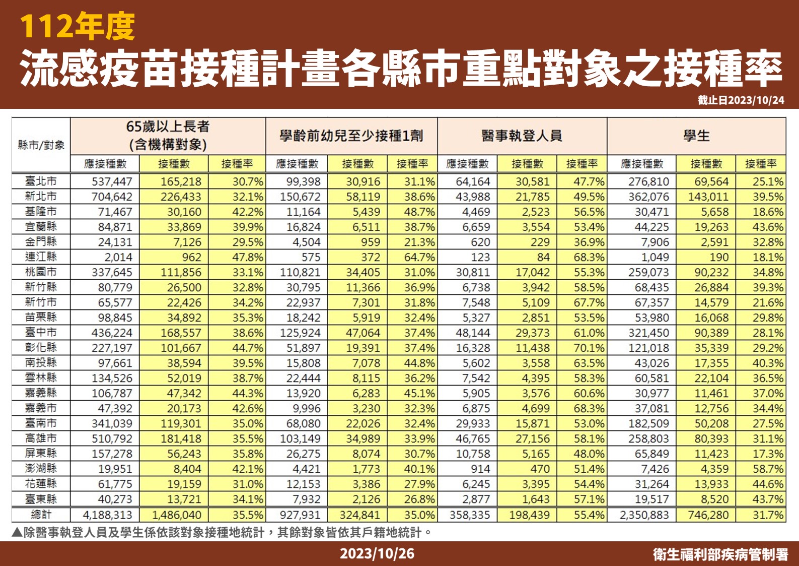 疾管署說明,本年度第一階段重點族群之接種率對象分別為,65歲以上長者35.5%,學齡前幼兒35%,醫事人員55.4%,以及學生31.7%(如附件),除學生族群依學校接種排程於11月底前完成,籲請其餘符合第一階段公費條件者儘速完成接種,另請長照機構落實感控措施,及早安排住民接種流感疫苗,以提升保護力,維護長者及高風險族群健康。