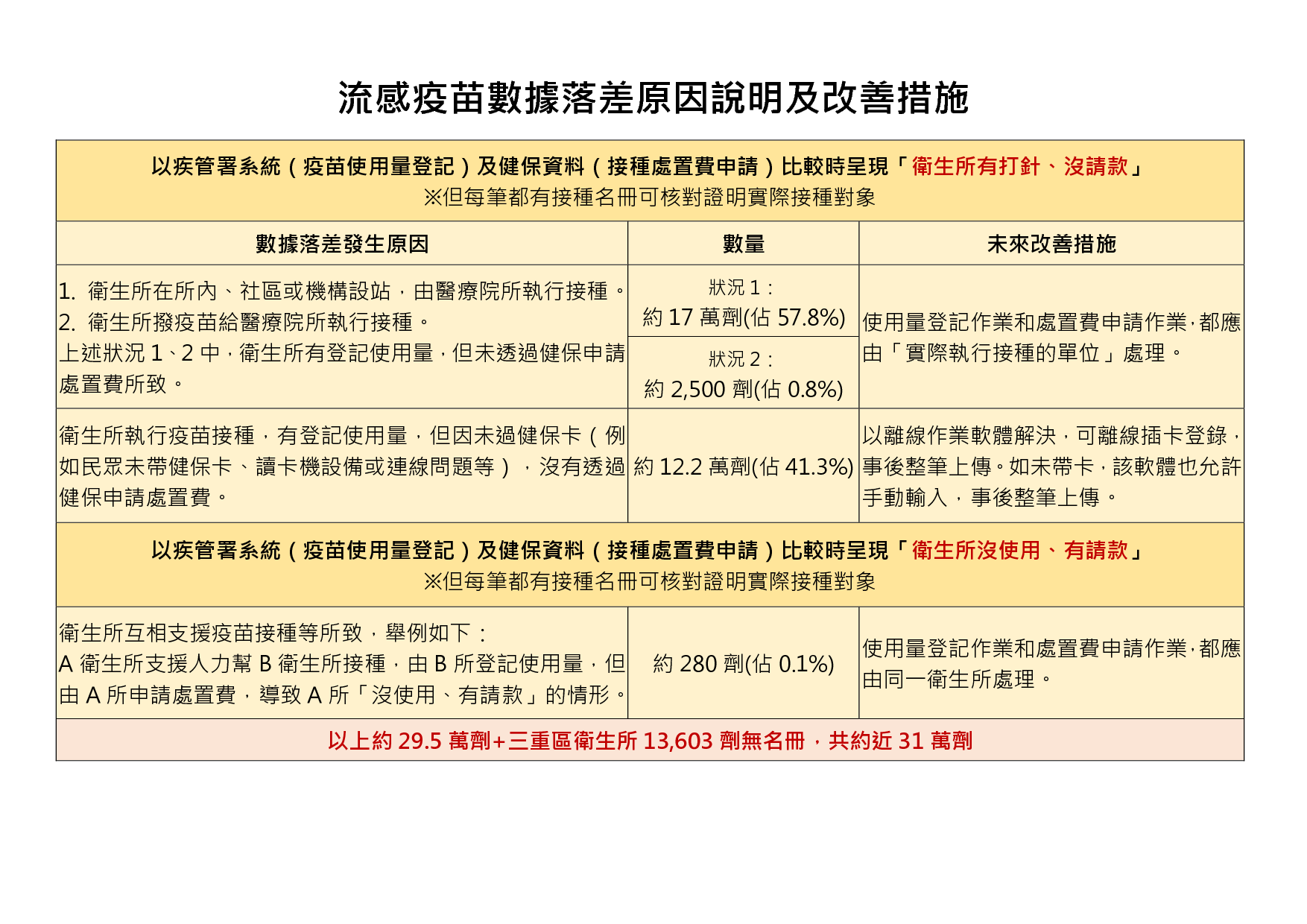 疾管署表示,衛生所與醫療院所執行流感疫苗接種作業時,需使用疾管署的「流感疫苗管理系統」登記疫苗使用量,與透過健保申請接種處置費,依據22個縣市政府衛生局查對後的回報資料顯示,除了新北市某衛生所13,603劑無接種名冊,其餘29萬多劑均有接種名冊可核對證明實際接種對象,但由於衛生所及醫療院所執行接種作業時出現下列情形,導致比較疾管署系統與健保資料時出現數據落差: