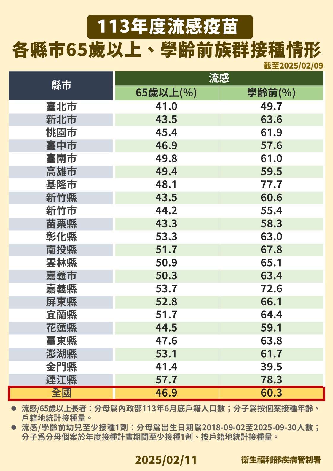 疾管署統計,截至今(2025)年2月10日止,公費流感疫苗共計接種657.3萬劑(疫苗使用率99.8%),尚餘公費疫苗1.3萬劑。考量目前仍為流感疫情高峰期,為提升較高風險族群接種率,疾管署已依行政院指示增購10萬劑流感疫苗,最快2月20日起提供11類原計畫第一階段實施對象(65歲以上長者、55歲以上原住民、安養/長期照顧(服務)等機構對象、滿6個月以上至國小入學前幼兒、具潛在疾病者(含高風險慢性病人、BMI≧30者、罕病及重大傷病患者)、孕婦、6個月內嬰兒父母、醫事及衛生防疫相關人員、國小至高中/職/五專三年級學生、幼兒園及居家托育人員、禽畜及動物防疫相關人員)接種。