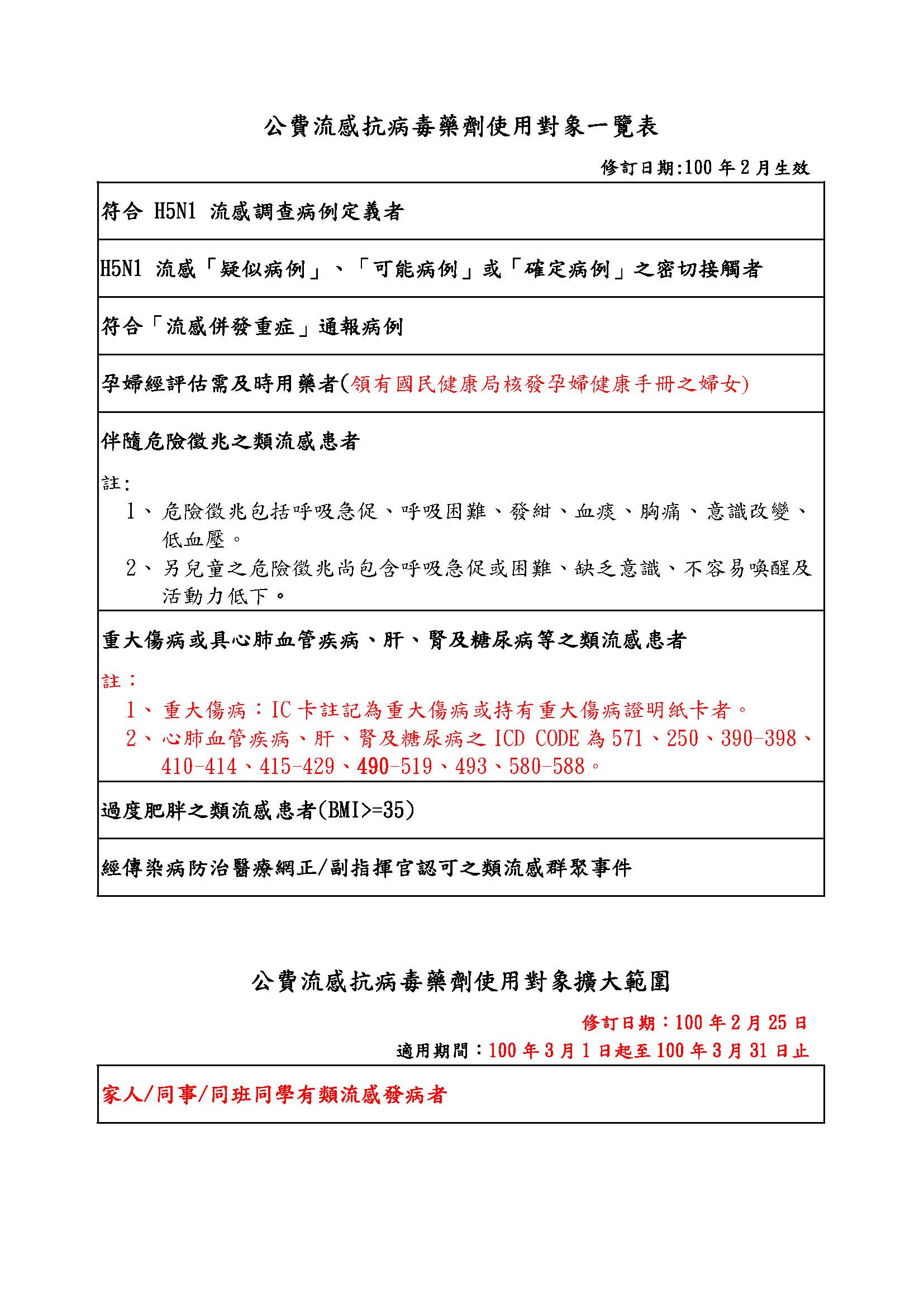 為因應流感防治之需求,本局已參照本署傳染病諮詢委員會-流感防治組、預防接種組委員意見,將公費抗病毒藥劑擴大使用範圍由原來的「高燒持續48小時」及「流感患者之共同居住成員有類流感症狀者」二項,整併修正為「類流感患者之家人/同事/同班同學有類流感發病者」一項。因此至100年3月31日前,公費抗病毒藥劑用藥對象除原訂之(1)H5N1 流感調查病例、(2)H5N1 流感「疑似病例」、「極可能病例」或「確定病例」之密切接觸者、(3)流感併發重症通報病例、(4)伴隨危險徵兆之類流感患者、(5)具重大傷病或心肺血管疾病、肝、腎、及糖尿病等之類流感患者、(6)經醫師評估需及時用藥之孕婦、(7)過度肥胖之類流感患者、(8)其他經正/副指揮官認可之類流感群聚事件之治療或預防等對象外,尚包括(9)「家人/同事/同班同學有類流感發病者」(詳如附件一)。