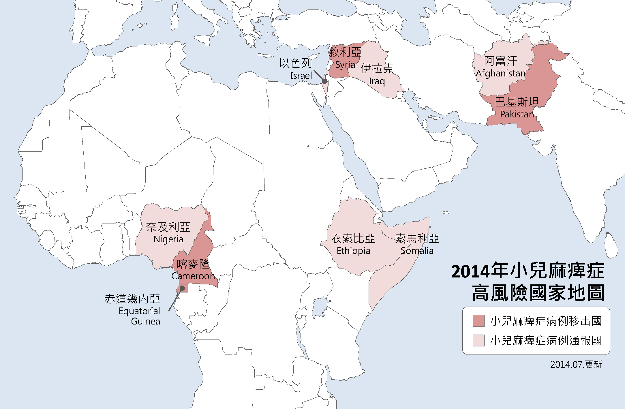 世界衛生組織於5月5日列出10個小兒麻痺高風險國家(巴基斯坦、敘利亞、喀麥隆、赤道幾內亞、阿富汗、伊拉克、以色列、衣索比亞、索馬利亞、奈及利亞),並將國際間小兒麻痺症傳播列入國際關注公共衛生緊急事件。疾管署表示,國人於前述國家停留逾4週者,離境前應確保完成小兒麻痺疫苗接種,並由接種醫院開立國際預防接種證明書。