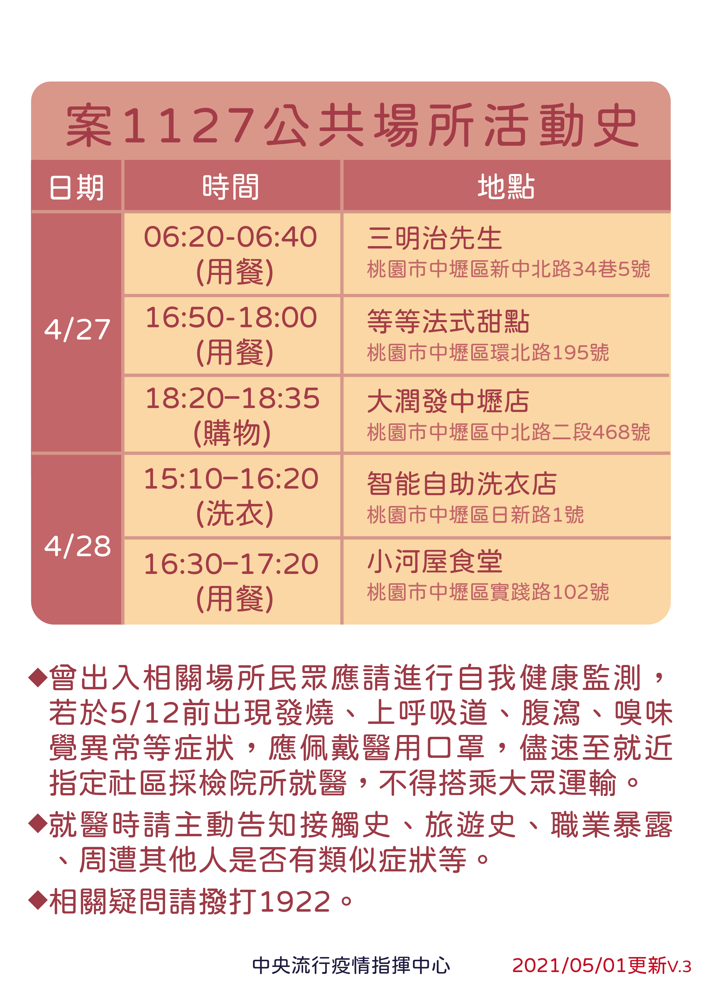 指揮中心說明,案1133為本國籍未滿5歲男童,近期無出國史,今(2021)年4月25日匡列為居家隔離對象,4月29日出現發燒症狀,由衛生單位安排就醫採檢,於今日確診(Ct值18)。個案家庭接觸者2人,延長居家隔離日期至5月15日。