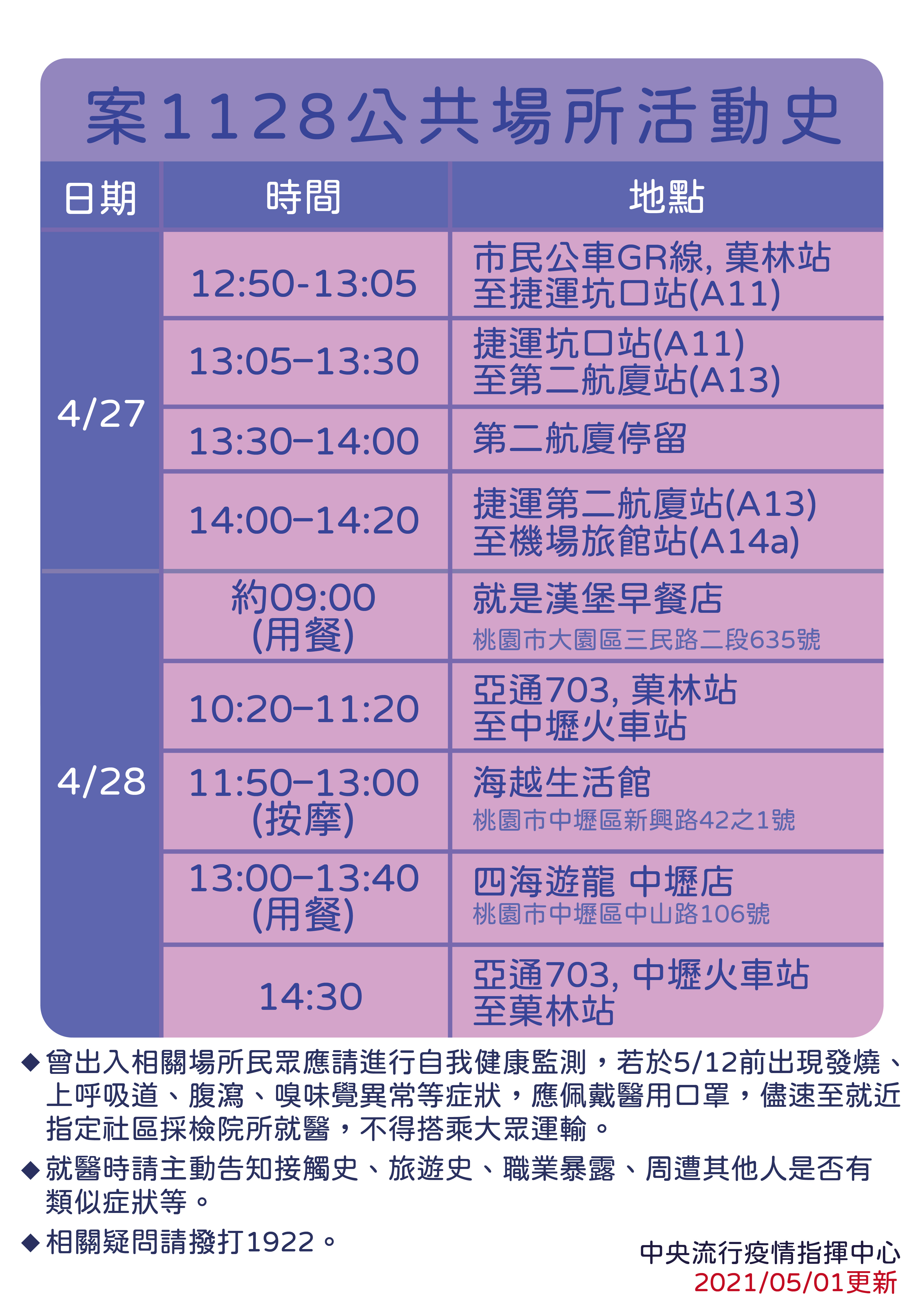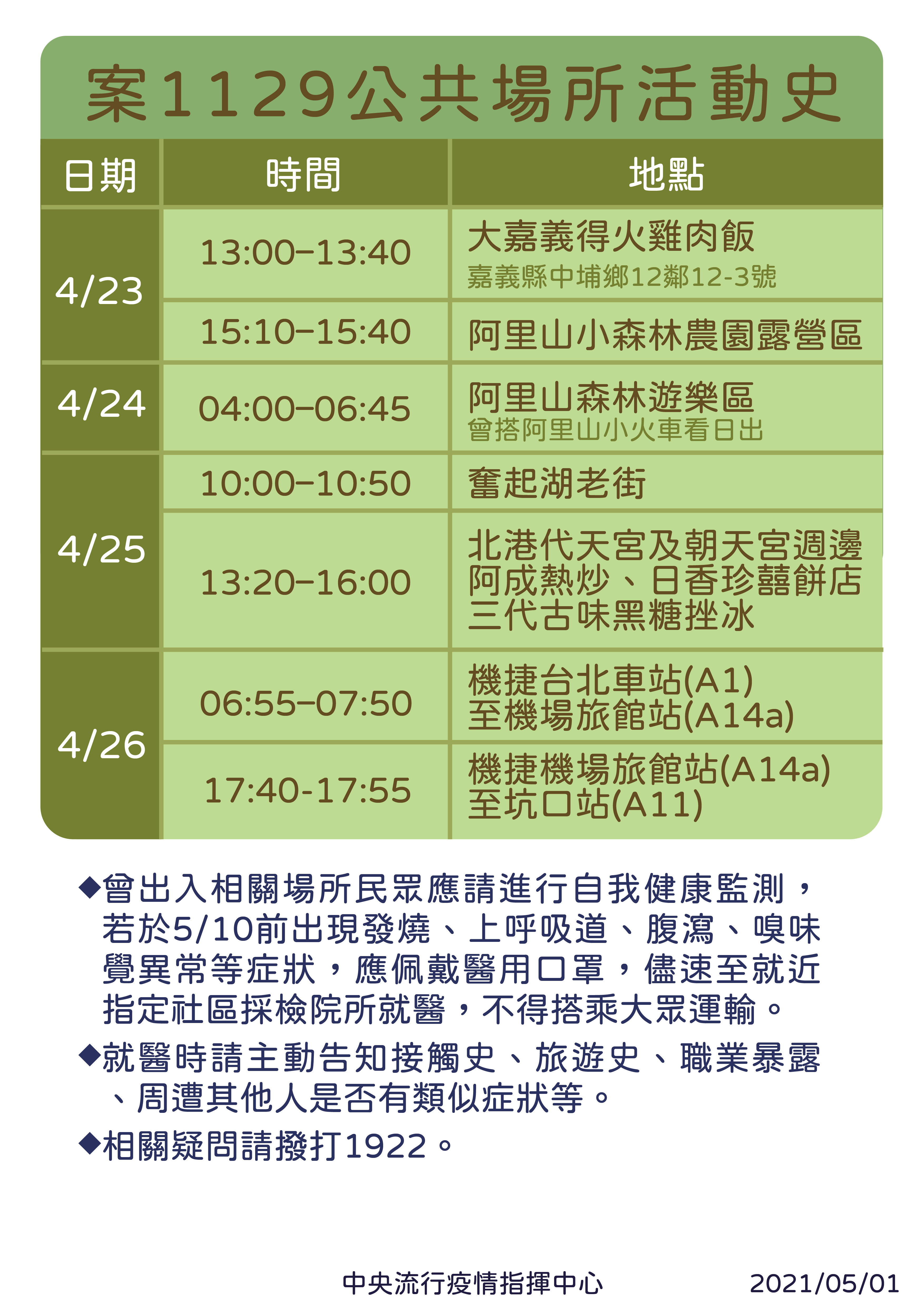 指揮中心說明,針對案1129之活動史,因曾到過嘉義,相關接觸者共10名,其中6人核酸檢驗陰性,其餘檢驗中。
