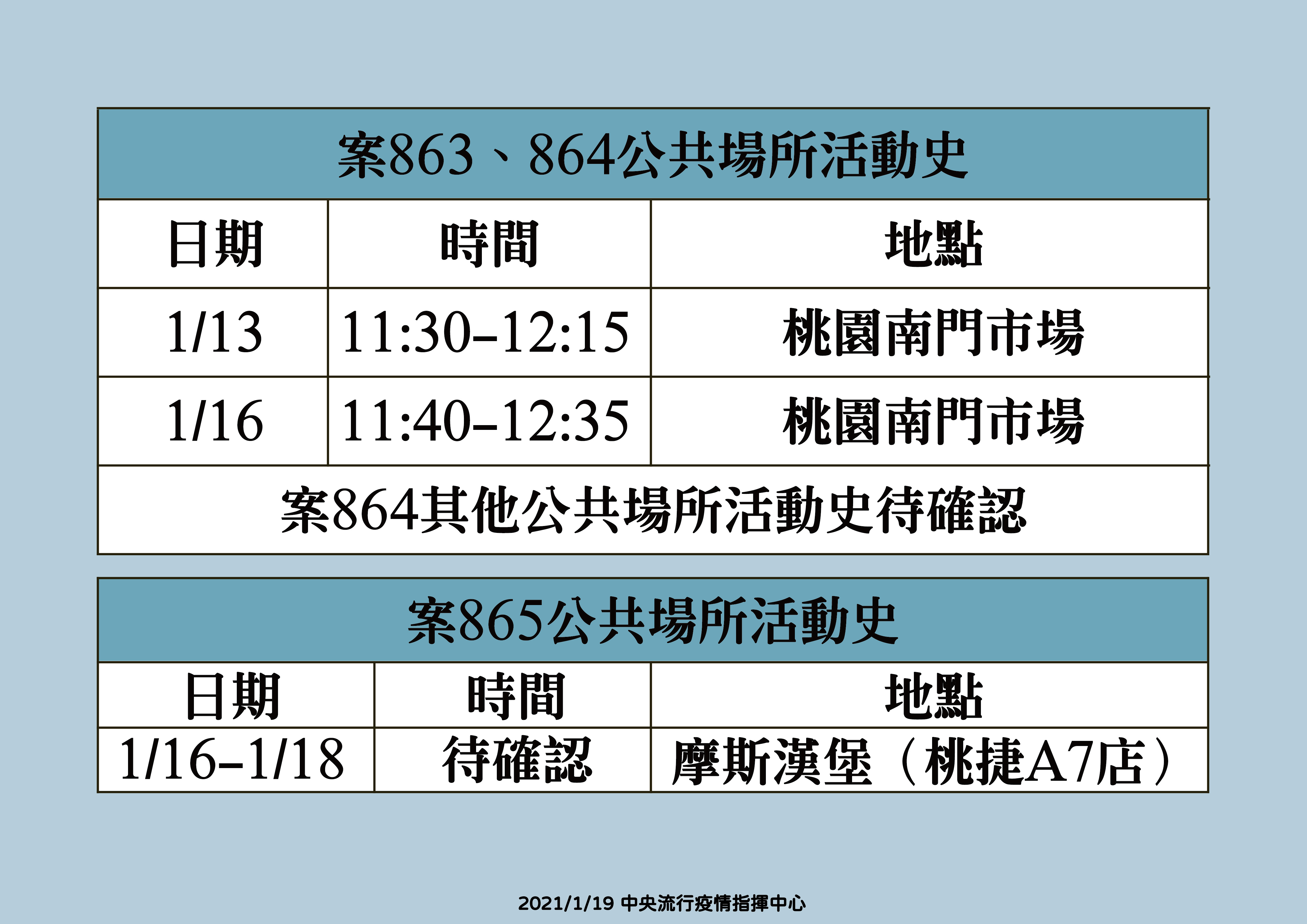 因應家庭群聚事件,衛生單位於接獲通報後,隨即展開疫情防治及調查。初步調查顯示,案863、864、865可傳染期間曾有公共場所活動史(如附件),提醒曾於附件所列時段出入相關場所的民眾,請自主健康管理,2月1日前如出現疑似症狀,應確實佩戴醫用口罩,儘速就醫,且不得搭乘大眾交通運輸工具;就醫時請主動告知接觸史、旅遊史、職業暴露及身邊是否有其他人有類似症狀;返家後亦應佩戴口罩避免外出,與他人交談時應保持1公尺以上距離。