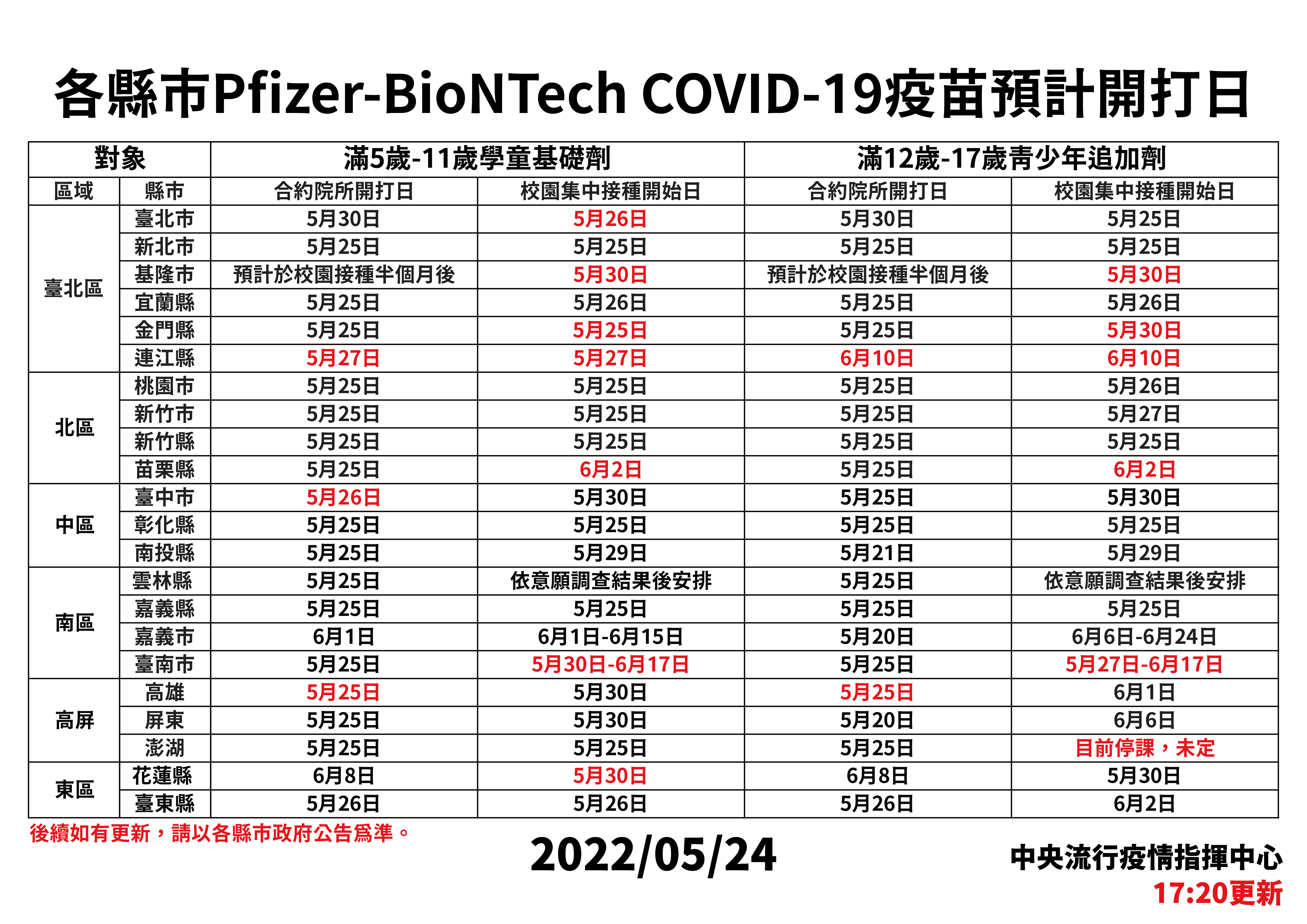 中央流行疫情指揮中心今(24)日說明,有關滿5至11歲兒童施打之Pfizer-BioNTech COVID-19兒童疫苗接種事宜,已於今(2022)年5月16日函請教育部及各地方政府衛生局配合,自5月25日起,依期程規劃陸續於校園或指定/安排合約醫療院所提供接種。