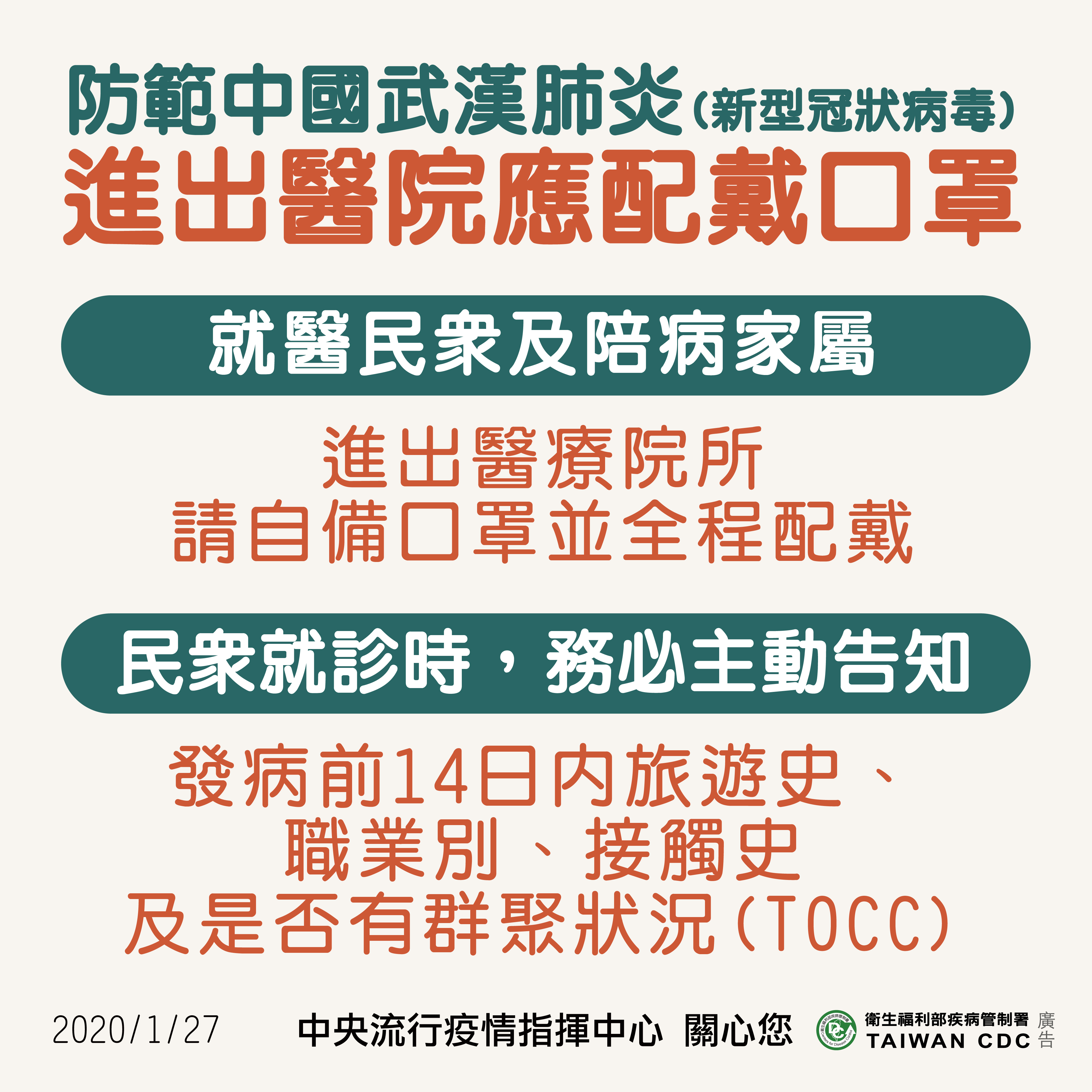 防範中國武漢肺炎 進出醫院應配戴口罩