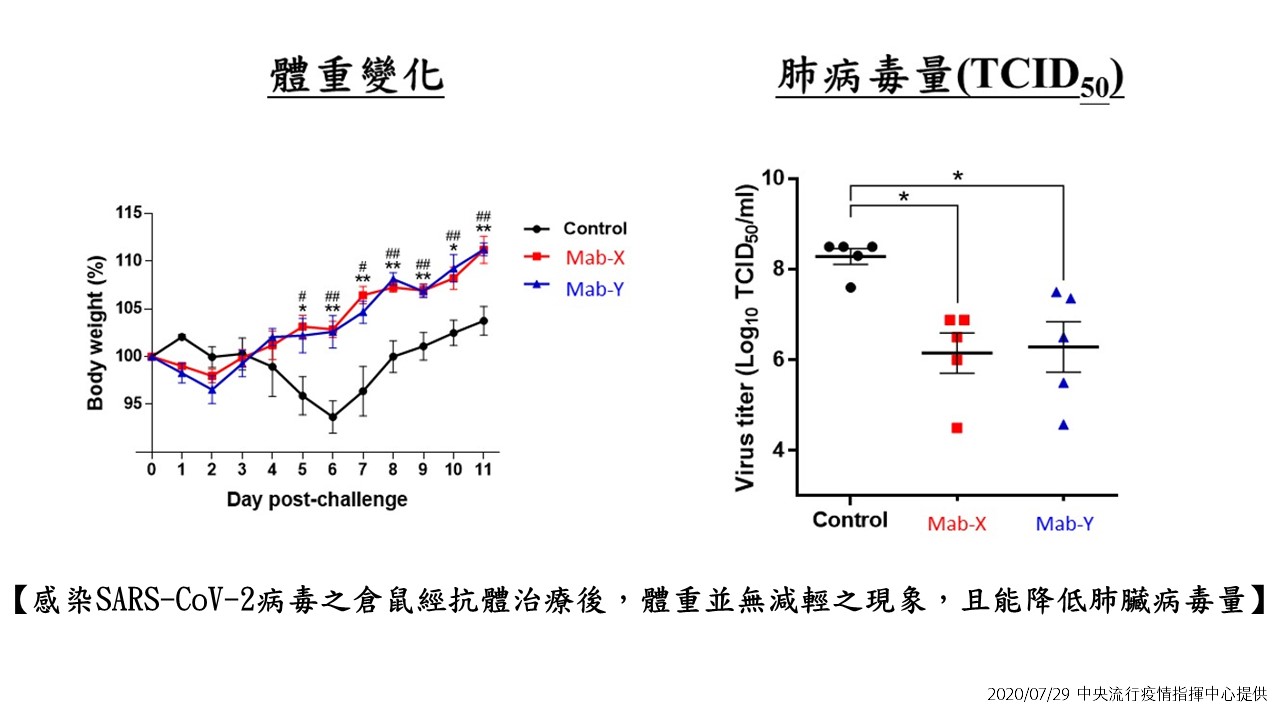 中央流行疫情指揮中心今(29)日表示,國家衛生研究院(國衛院)與國防醫學院預防醫學研究所(國防醫學院預醫所)共同合作,以過去抗SARS病毒抗體為基礎,挑選出可辨識新型冠狀病毒(SARS-CoV-2)的抗體,投入新冠病毒治療性抗體的開發工作。研究團隊運用治療性抗體來治療感染新冠病毒的倉鼠,經動物試驗的結果發現,倉鼠的體重、活動力不會因此降低,肺部病毒量卻大幅下降,其對抗新冠病毒的治療效果令人振奮。