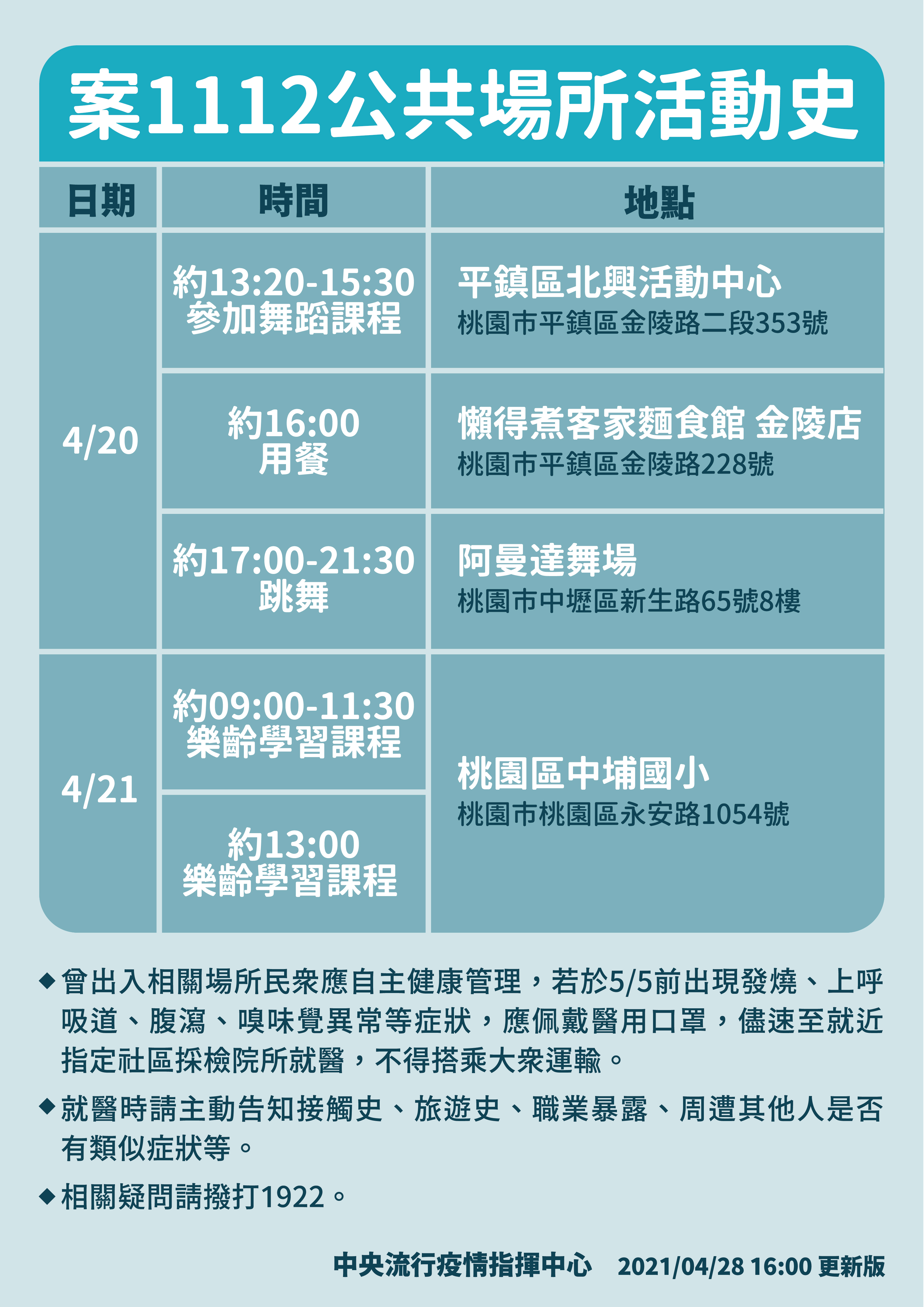 指揮中心表示,案1112為本國籍70多歲男性,為境外移入個案(案1068、案1106)之非同住家人,近期無出國史,亦無疑似症狀,曾因案1068居家檢疫期間於住處跌倒,前往該案住處停留半個多小時,另於案1106居家隔離期間,協助送餐事宜。衛生單位於4月26日安排案1112進行接觸者採檢,於今日確診(Ct值26)。已初步掌握個案接觸者190人,列居家隔離。另由於個案曾有公共場所活動史(如附件),提醒曾於附件所列時間及場所活動的民眾,自主健康管理14天,如有疑似症狀,請儘速戴口罩就醫,並主動告知醫師活動接觸史。