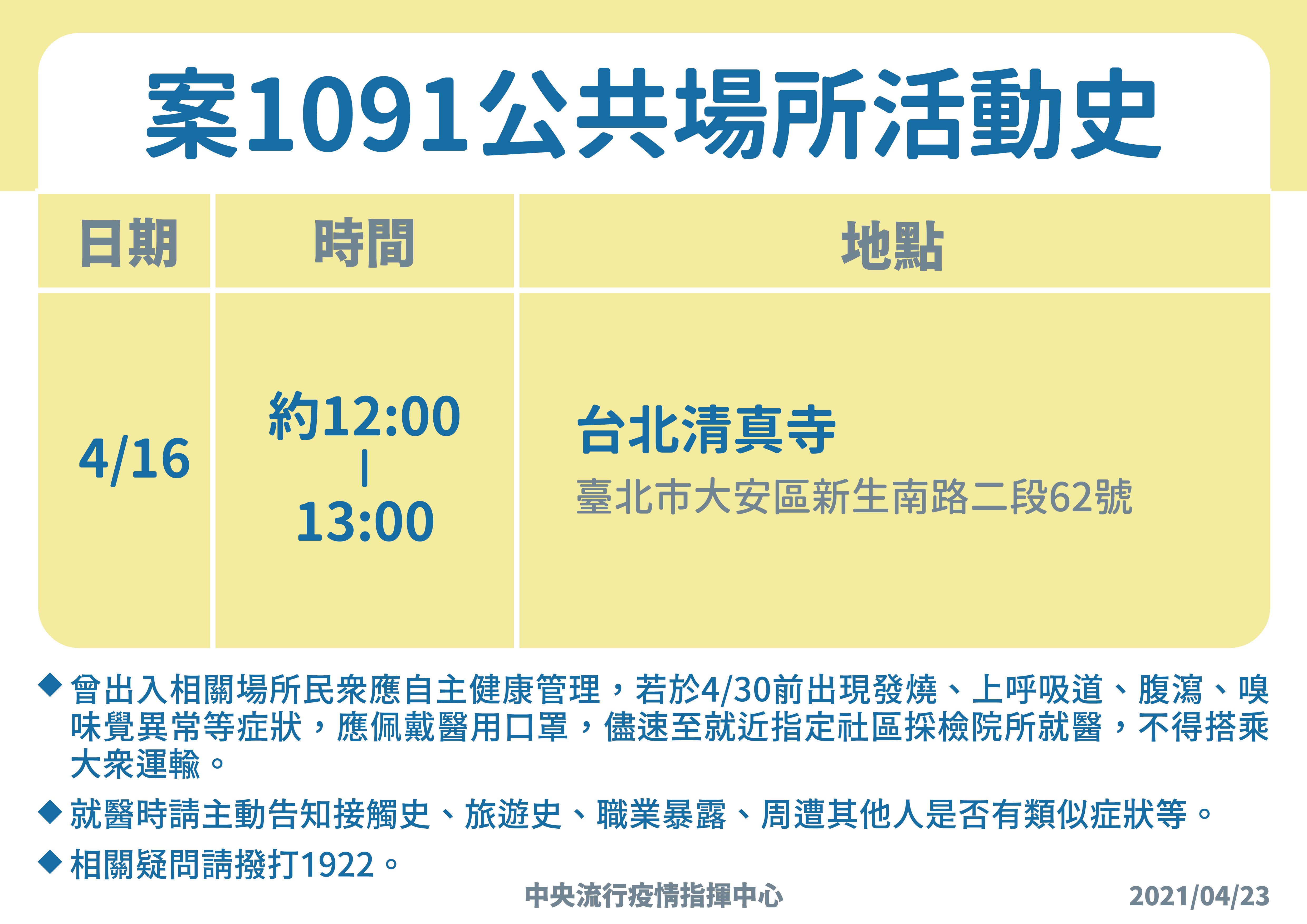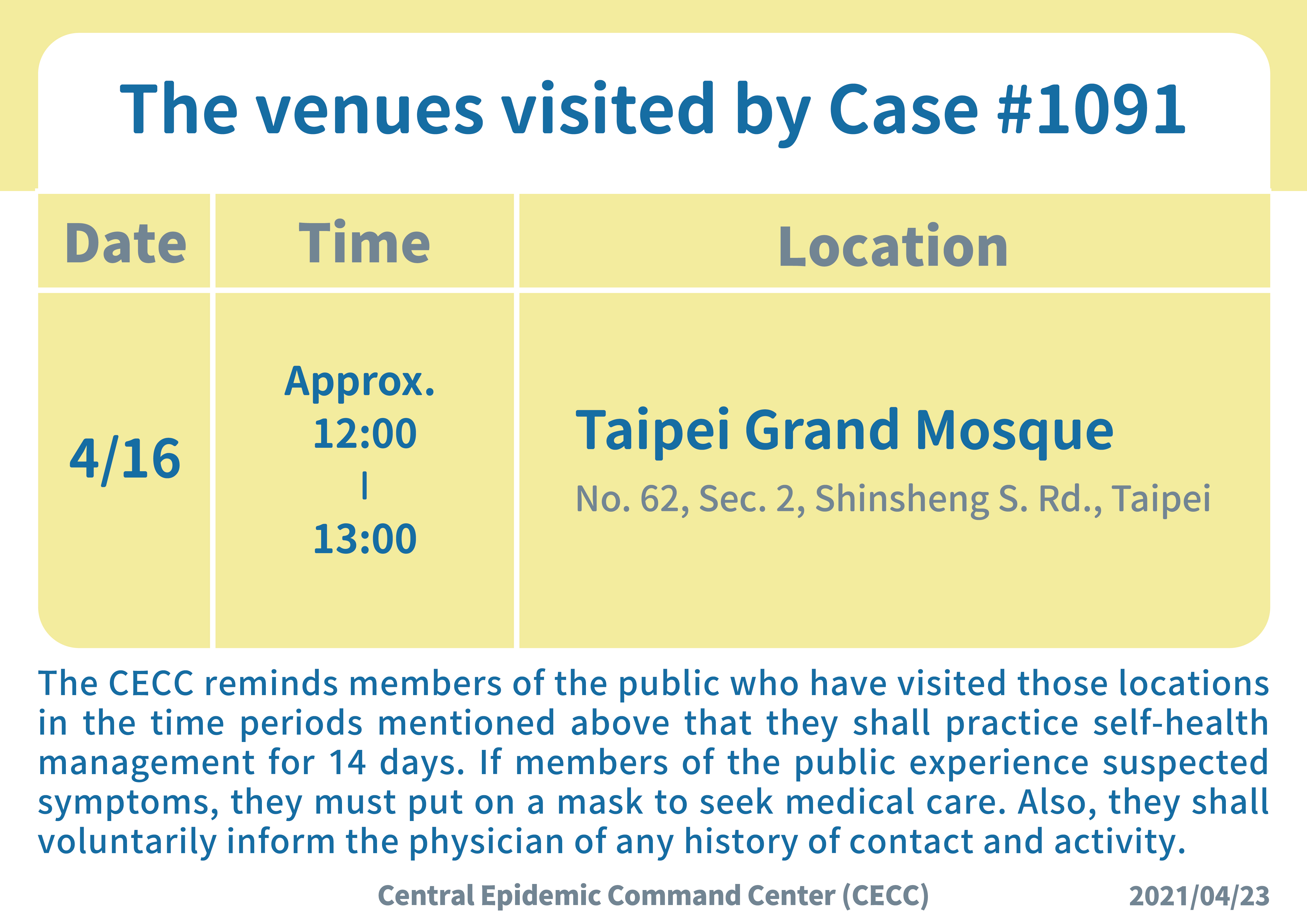 指揮中心指出,案1091為印尼籍50多歲男性,為該名機師之同事,4月4日至4月10日曾執勤至美國,期間無症狀,返臺後於4月15日進行檢疫期滿採檢,結果為陰性;個案4月16日自覺有疲憊、身體微熱情形,同日中午與該機師及案1090一同於台北清真寺活動,4月18日出現輕微咳嗽症狀,經服藥後症狀改善,因預計返回印尼探親,4月21日進行自費採檢,於今日確診(Ct值27)。