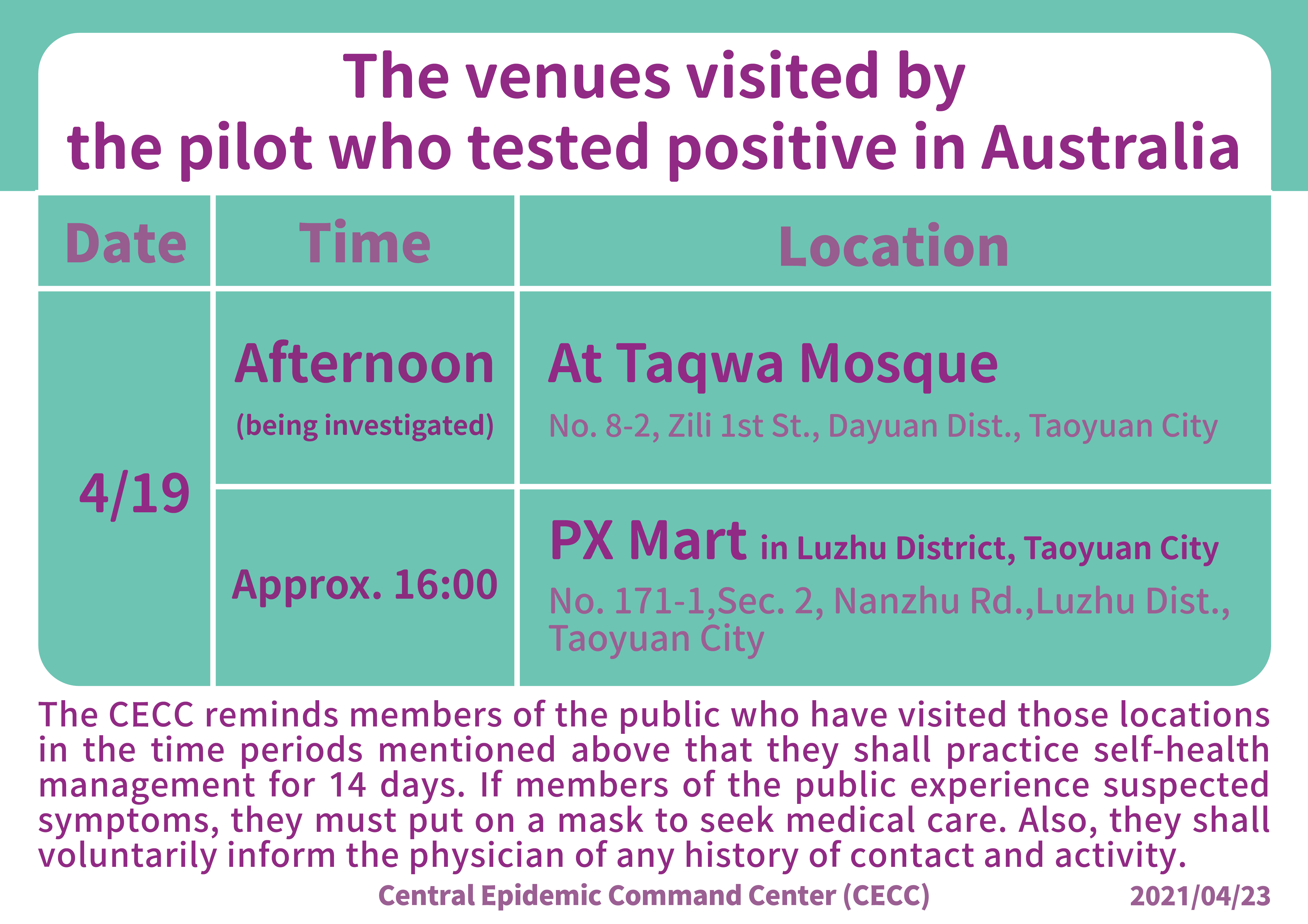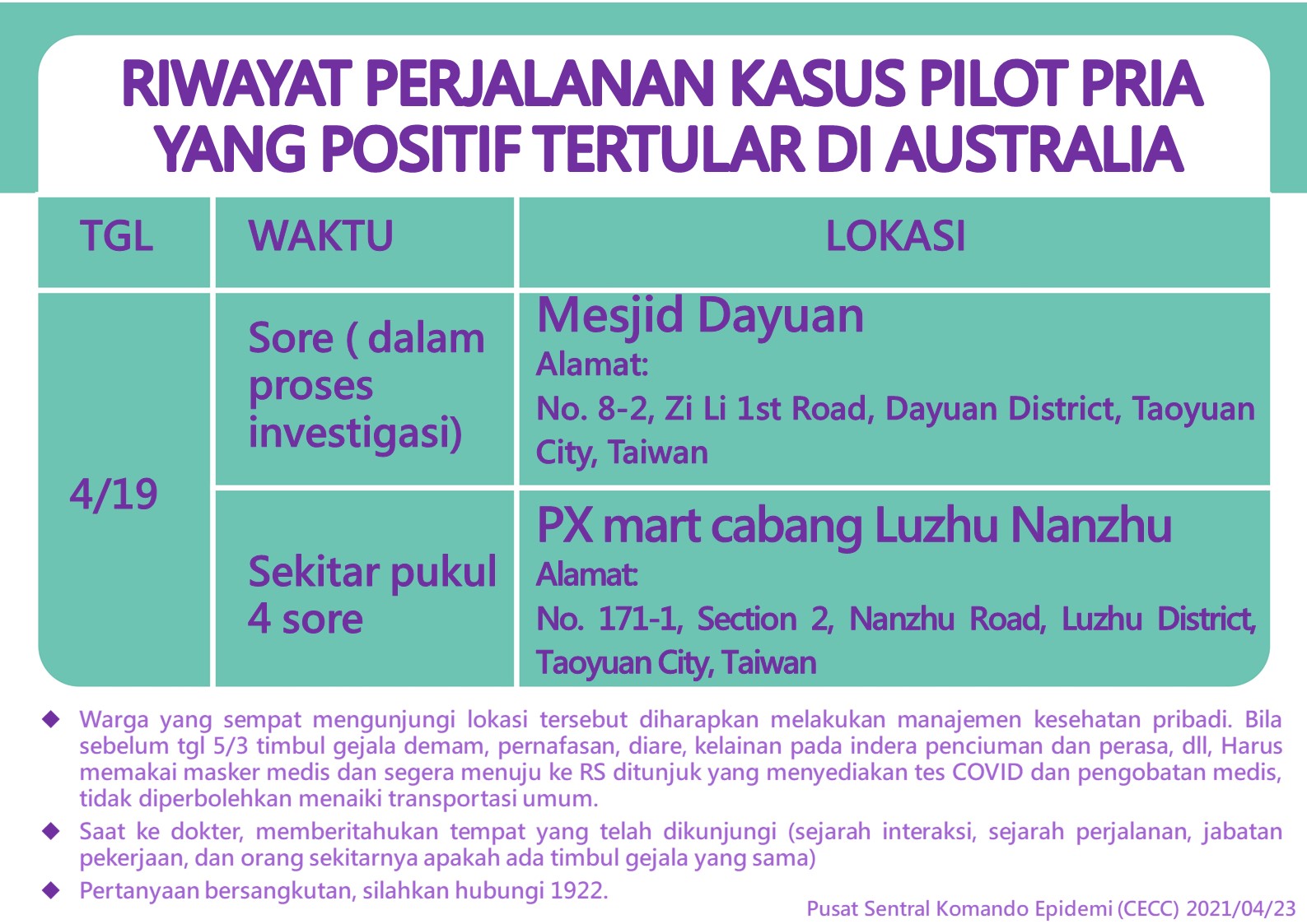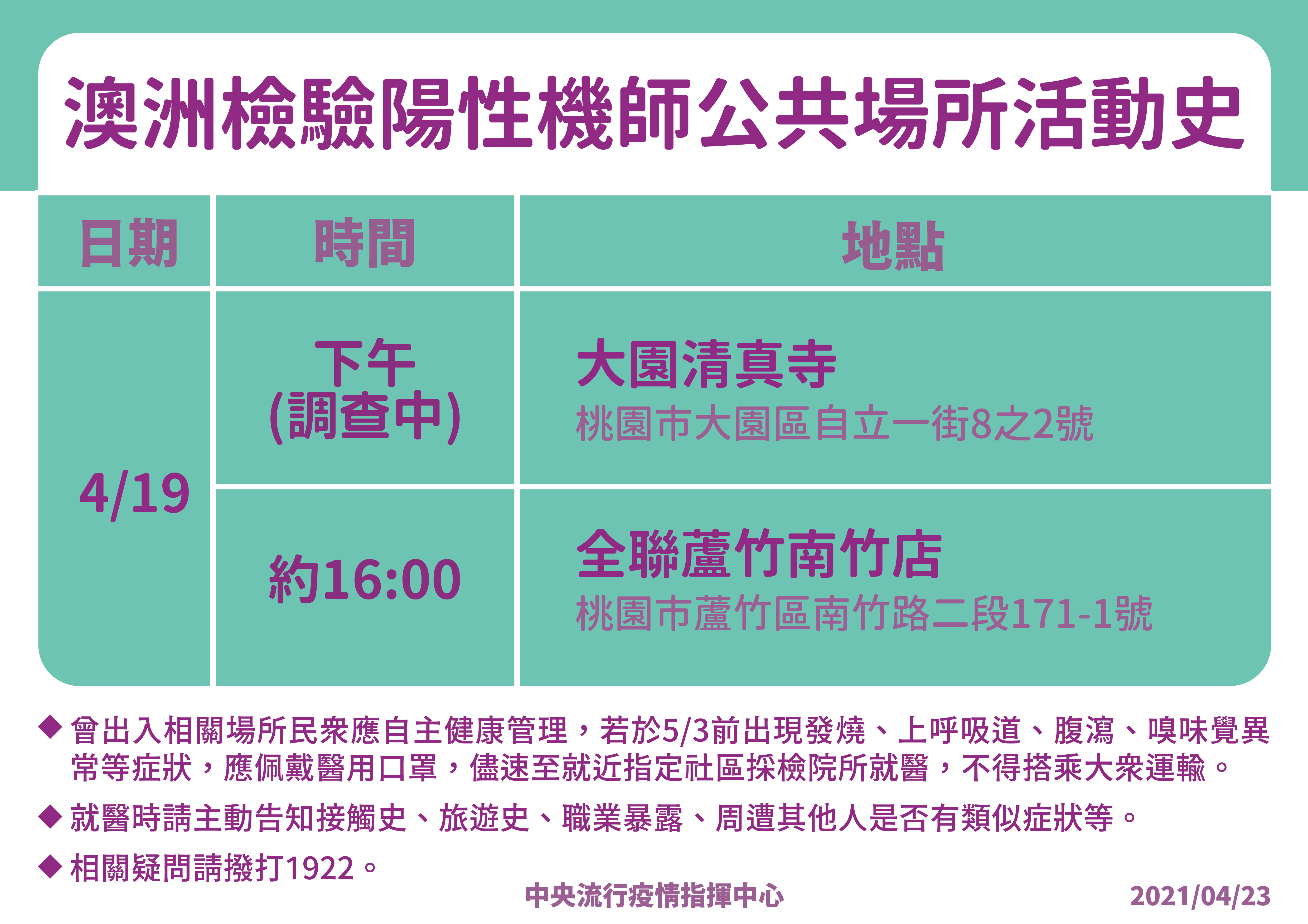 中央流行疫情指揮中心今(23)日表示,我國今(2021)年4月21日接獲我國某航空公司通報,該公司1名印尼籍40多歲男性貨機機師,4月20日執勤至澳洲時,自覺出現喉嚨癢情形,並於當地檢出COVID-19陽性,指揮中心隨即啟動個案在臺活動史之調查,並針對在臺接觸者匡列及採檢,其中2名接觸者檢出陽性,於今日確診(案1090、1091)。