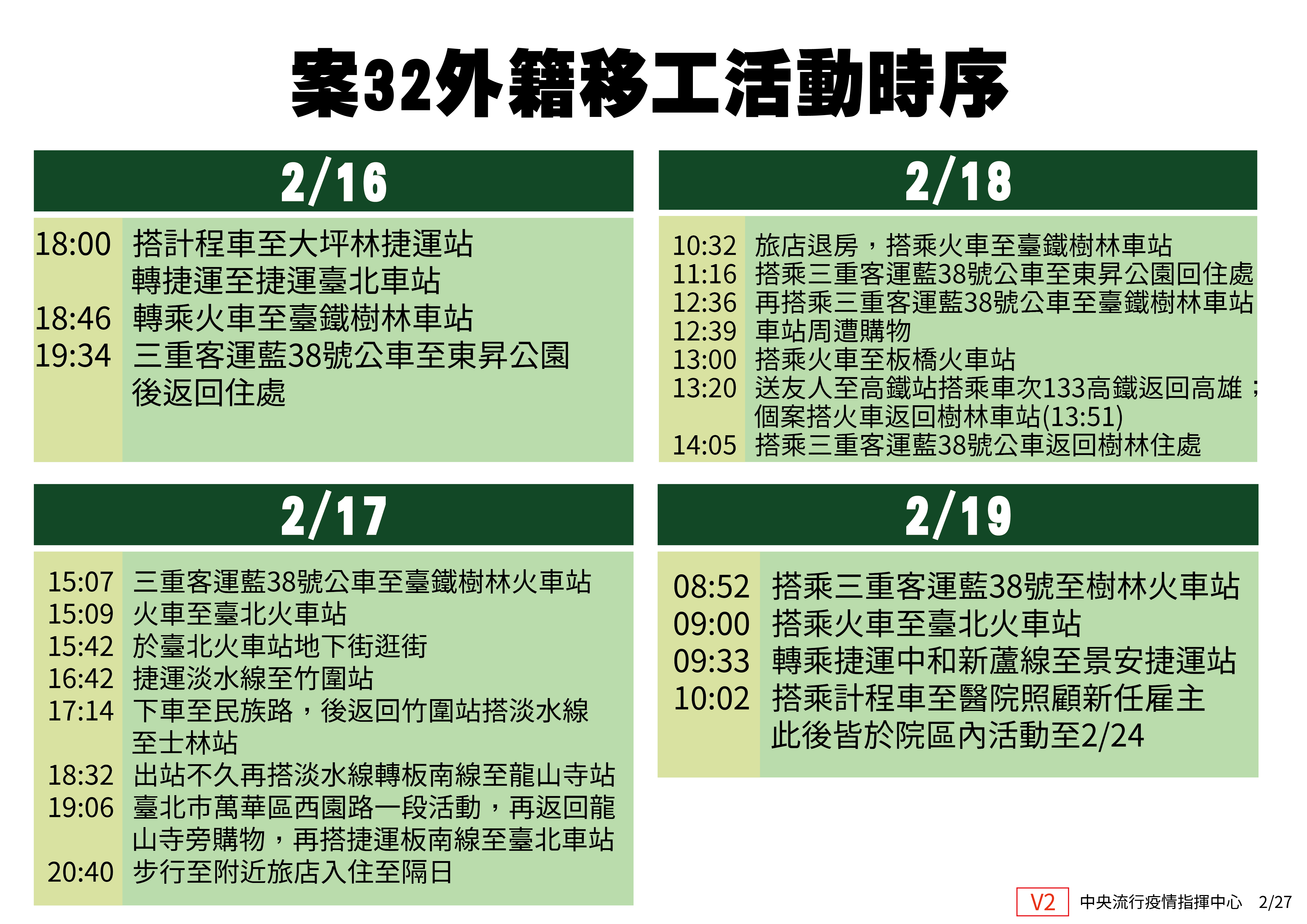 中央流行疫情指揮中心今(27)日表示,為釐清案32(外籍看護)於2月16日至24日間之活動史與接觸者,經衛生、警政單位密切調查個案活動軌跡發現,個案於上述期間曾多次搭乘公車、捷運等大眾交通運輸,並有多處公共場所活動史(如附件),提醒曾於所列時段出入相關場所的民眾,請自主健康管理14天,如有疑似症狀,請儘速戴口罩就醫,並主動告知醫師活動接觸史。針對案27群聚,截至目前已掌握接觸者801人,並採檢180人,其中5人陽性(案28至32)、159人陰性,其餘檢驗中。