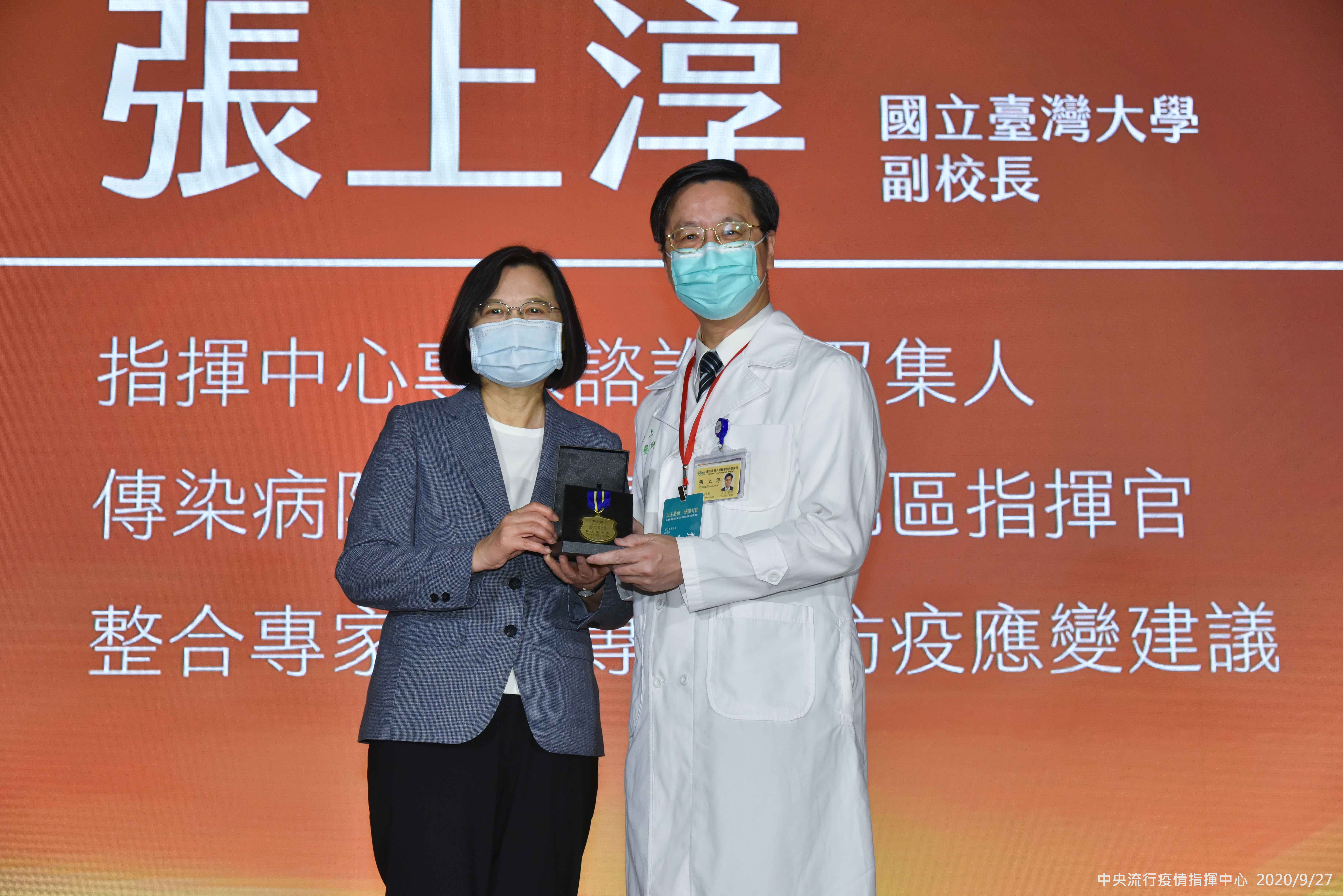 指揮中心表示,由總統蔡英文和行政院長蘇貞昌聯署頒發,表彰本次武漢肺炎疫情期間為國人無私奉獻的「防疫獎章」,共製作頒發給15,964位防疫有功的個人及公司團體。