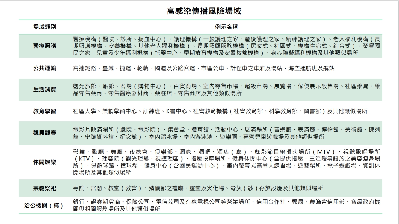 指揮中心指出,連假期間民眾出入「醫療照護、公共運輸、生活消費、教育學習、觀展觀賽、休閒娛樂、宗教祭祀、洽公機關(構)」等八大類場所(場所舉例如附表),應佩戴口罩;若有飲食需求,在與不特定對象保持社交距離或有適當阻隔設備的前提下,可在飲食期間暫時取下口罩。如未依規定佩戴口罩,且經勸導不聽者,將依違反傳染病防治法第37條第1項第6款規定,由地方政府裁罰新臺幣3千元以上1萬5千元以下罰鍰。