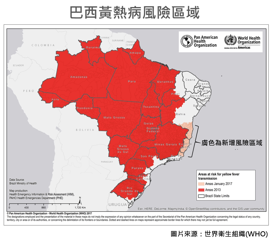 依據國際監測資料顯示,巴西今(2017)年截至1月30日累計通報568例黃熱病疑似病例,其中107例確診,113例死亡,以米納斯吉拉斯州佔近9成最多,並新增感染州別,世界衛生組織表示,因人口與動物之流動、部分地區疫苗覆蓋率低等因素,預期疫情可能擴散且傳播風險高。目前已將巴伊亞州(Bahia State)南部及西南部部分行政區、聖埃斯皮里圖州(Espírito Santo State,除維多利亞市區以外全區)、里約熱內盧州(Rio de Janeiro State)北方部分行政區新增為風險地區(如附圖),建議欲前往旅客應加強疫苗接種。