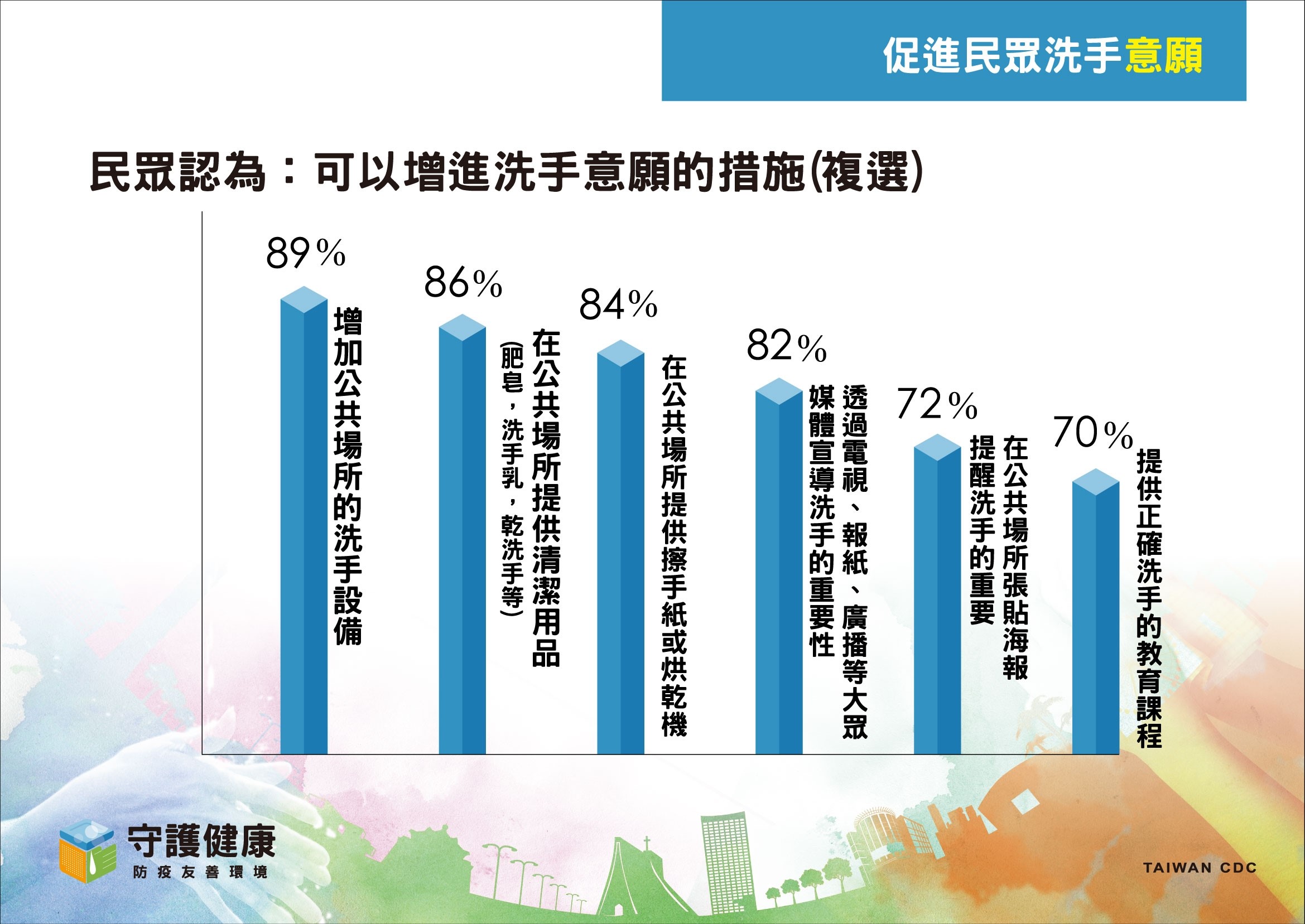 疾管局針對民眾洗手行為調查結果顯示,有近六成的民眾不知道不擦乾雙手,潮濕的雙手仍然會附著細菌;超過六成民眾未落實正確洗手(包含未以肥皂/洗手乳等洗手,或洗手後未擦乾);近五成民眾洗手過程中沒有使用清潔品(肥皂或洗手乳等)的習慣,亦有約三成民眾洗手後未把手擦乾。有鑑於此,該局以「肥皂勤洗手、擦乾後再走」為推廣主軸,廣邀民間企業共同推全民洗手運動,希望把正確洗手的觀念推廣到各處。