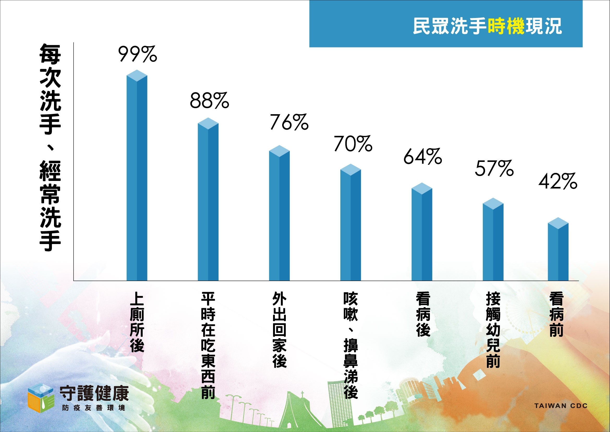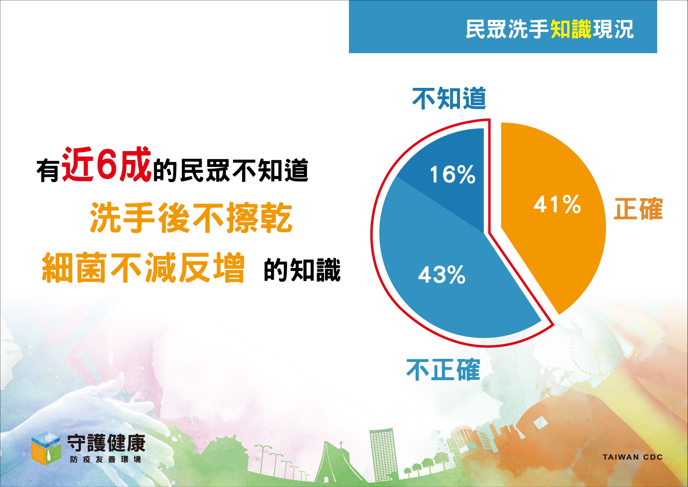 根據疾病管制局最新民調結果顯示,國內約六成民眾不知道洗手後沒擦乾,手上細菌會不減反增;有超過六成民眾未落實洗手動作,「洗了等於白洗」。該局推動「肥皂勤洗手、擦乾後再走」全民洗手運動,首波由旅遊及觀光旅館業率先響應,共同落實正確手部衛生習慣,以帶動民間企業加入洗手運動。