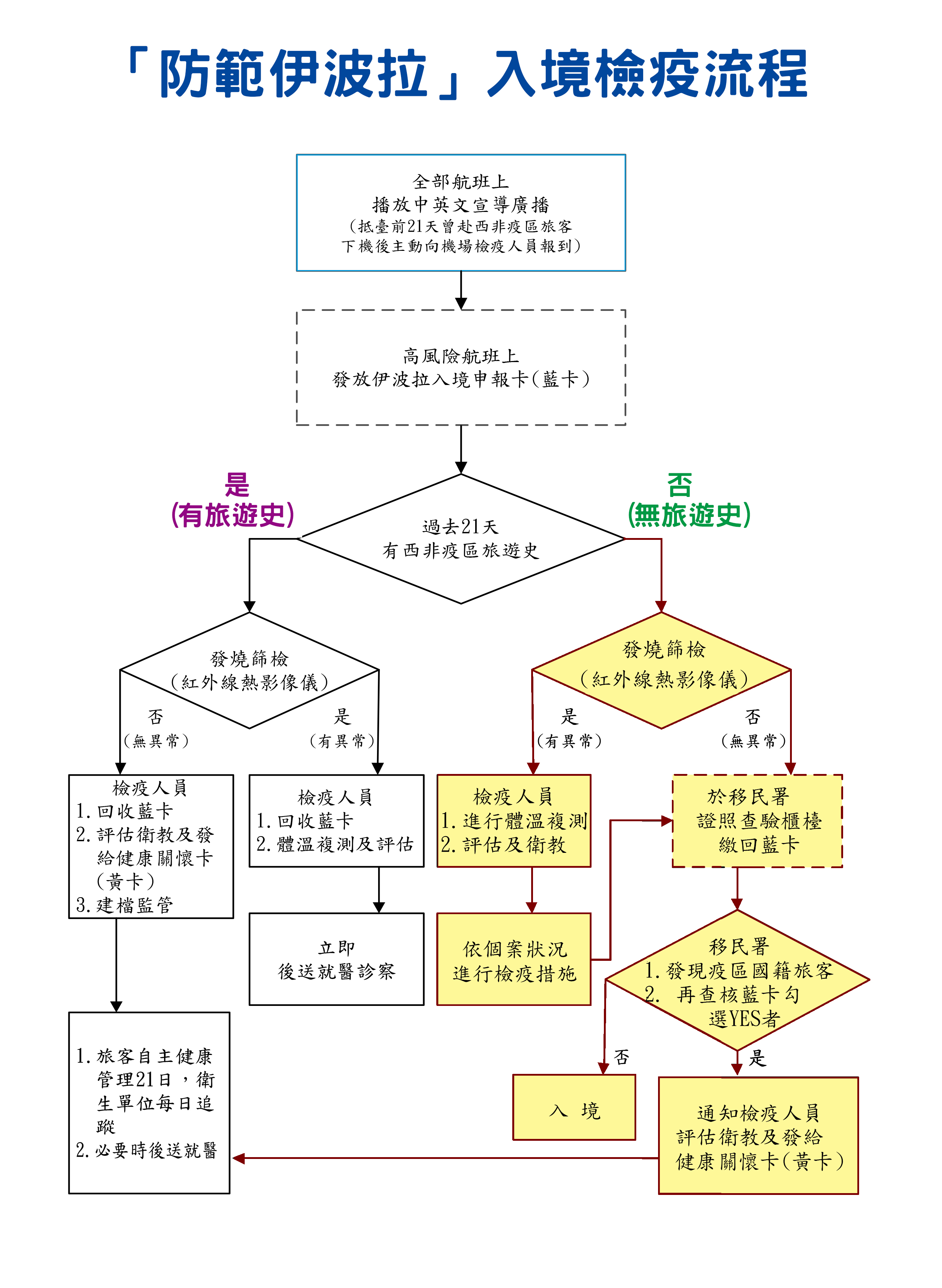 因應伊波拉國際疫情,疾管署持續於國際機場加強檢疫措施, 該署已請交通部及航空公司配合,於全部入境航機上進行廣播,提醒21天內曾有伊波拉疫區旅遊史旅客,於下機時應向疾管署檢疫人員報到。此外,自今(21)日起推出「伊波拉入境申報卡」(簡稱:藍卡),針對自歐洲、杜拜的航班,請旅客填寫21天內有無伊波拉疫區(幾內亞、賴比瑞亞及獅子山共和國)旅遊史,對於有旅遊史的入境旅客,檢疫人員將進行評估、衛教,及後續健康關懷。另移民署證照查驗人員遇伊波拉疫區國藉旅客時,亦將立即通知疾管署機場檢疫人員到場,進行必要檢疫措施。