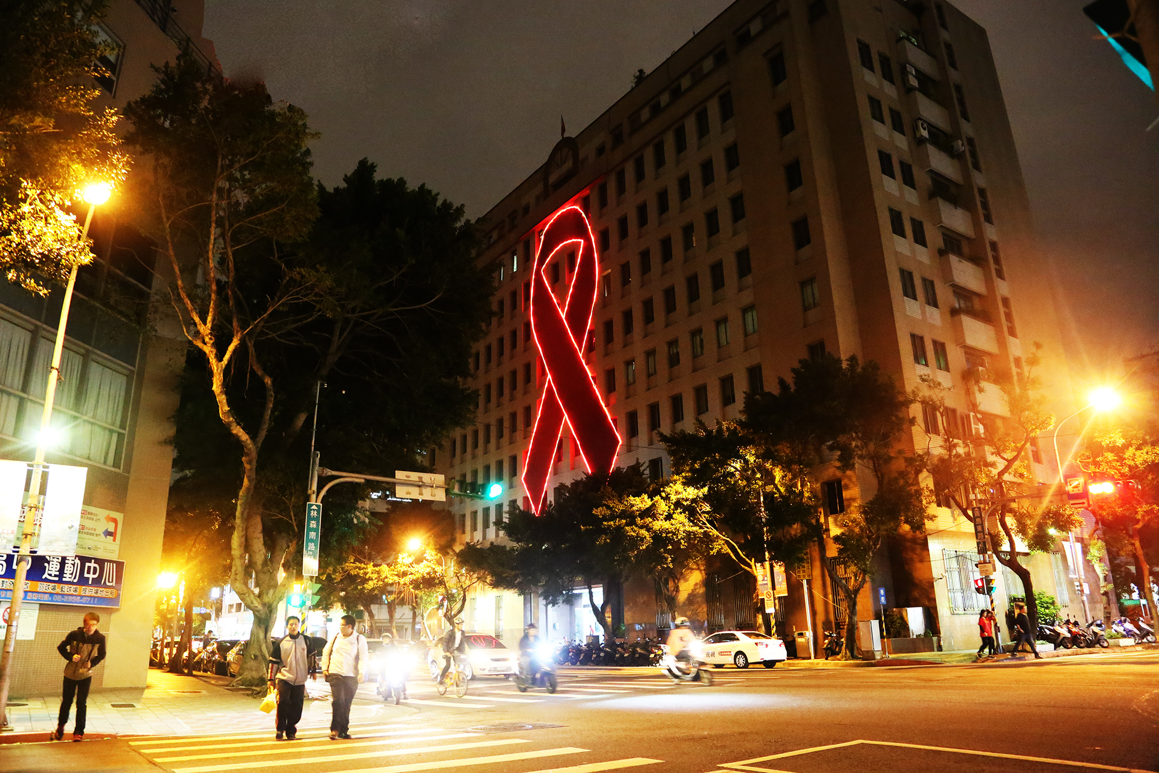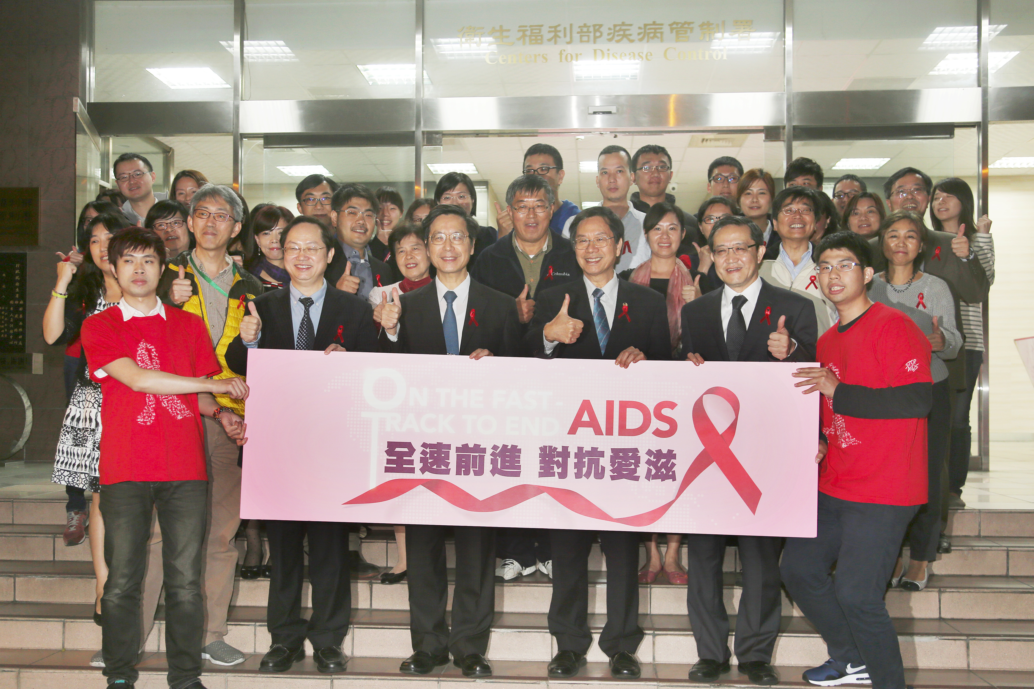 每年的12月1日為世界愛滋病日,聯合國愛滋病組織(UNAIDS)今年訂定的主題是「On the Fast-Track to end AIDS」, 希望透過各種階段性的防治作為,達成2030年終結愛滋的目標。疾病管制署於今(2015)年11月30日晚間響應世界愛滋病日,舉辦「全速前進,對抗愛滋」記者會。會中邀請衛生福利部蔣丙煌部長、疾病管制署郭旭崧署長、愛滋權益團體與保障會委員,為疾管署外牆首度點亮巨型紅絲帶造型燈飾,並自即日起於每晚6點後點亮紅絲帶,持續一個月,呼籲全民重視愛滋及關懷感染者。