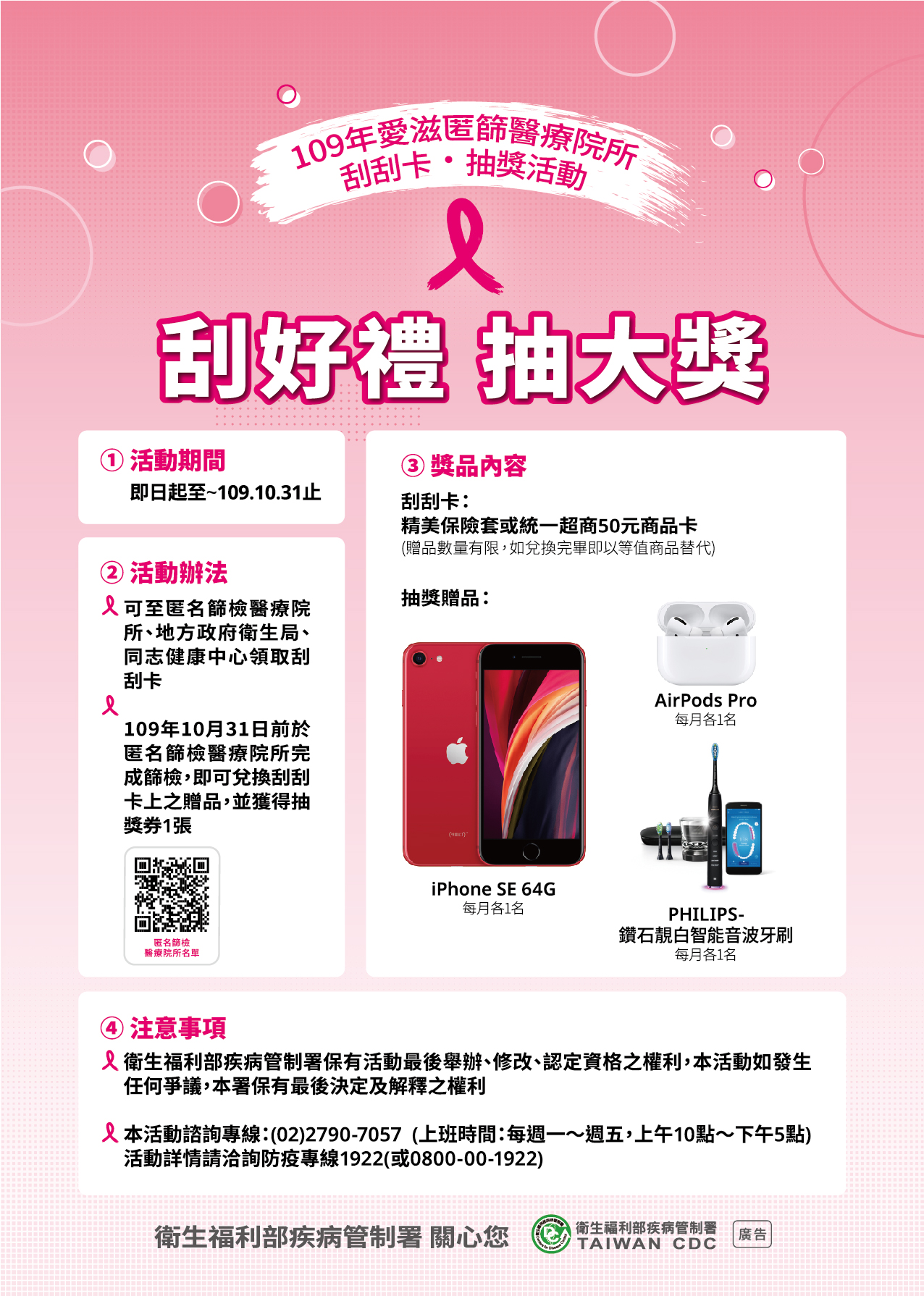 為鼓勵民眾瞭解自身健康狀況,疾病管制署自今(109)年8月18日起至10月31日,舉辦「愛滋匿名篩檢服務醫療院所刮刮卡及抽獎宣導活動」,活動期間民眾可至匿名篩檢醫療院所、衛生局(所)、同志健康中心等合作地點領取刮刮卡,並於匿篩院所完成愛滋匿名篩檢後,換取刮中之精美好禮,另可參加每月抽獎活動,有機會獲得智慧型手機、藍牙耳機及智能音波牙刷等大獎。