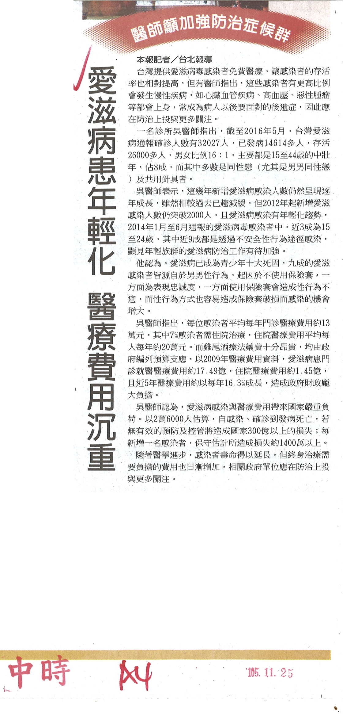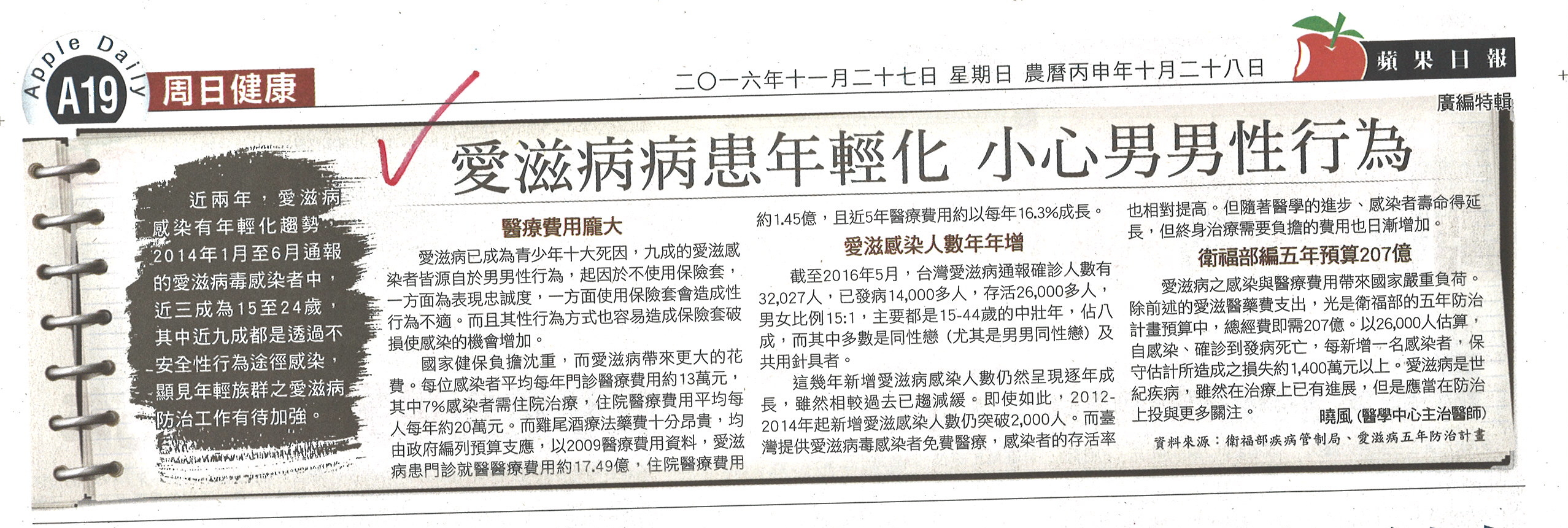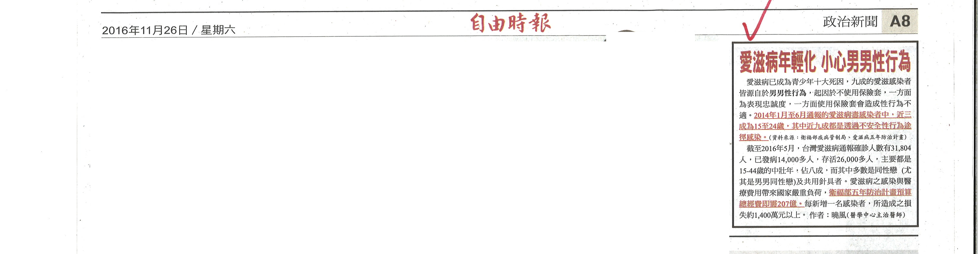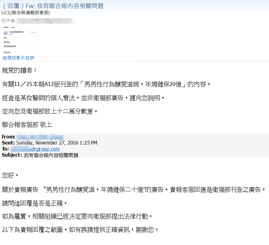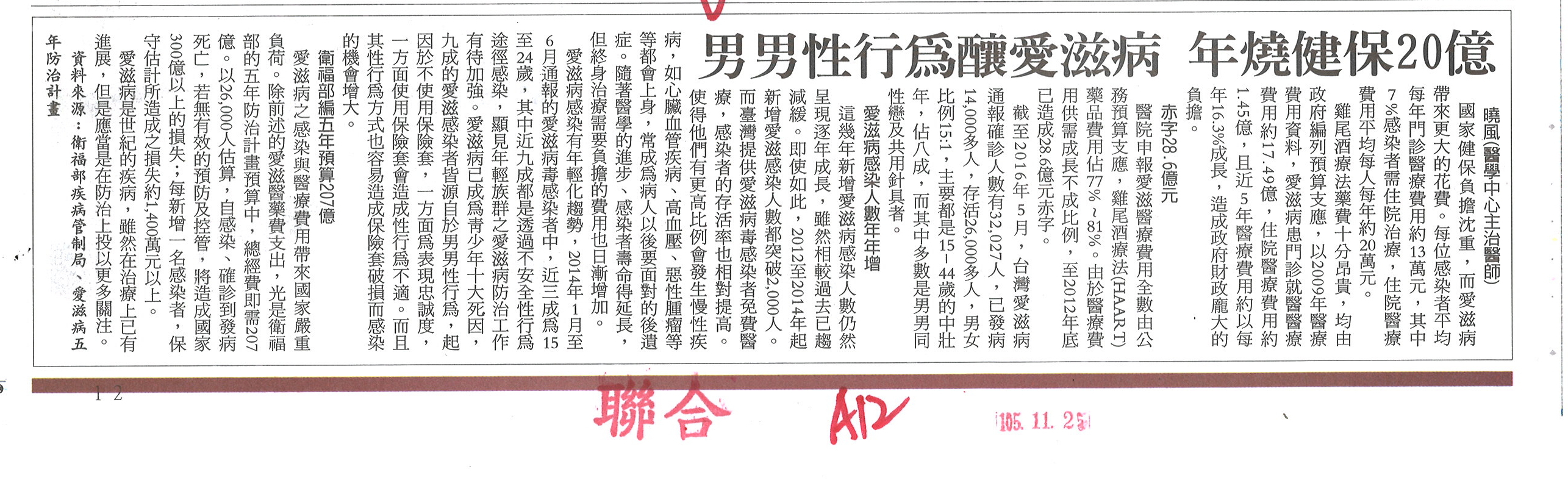 針對各大報於11月25日至27日間刊登愛滋病年輕化及男男性行為等相關議題之廣告(如附件),衛福部疾管署嚴正表示,該署未曾於上述時間於任何媒體刊載愛滋相關廣告,經查該則訊息為某醫師引用疾管署相關統計數據,以個人看法撰文並刊登於各媒體。另有網友於社群網站上流傳此為衛福部廣告之錯誤訊息,疾管署特別提醒,民眾如有收到相關消息勿隨意轉發。