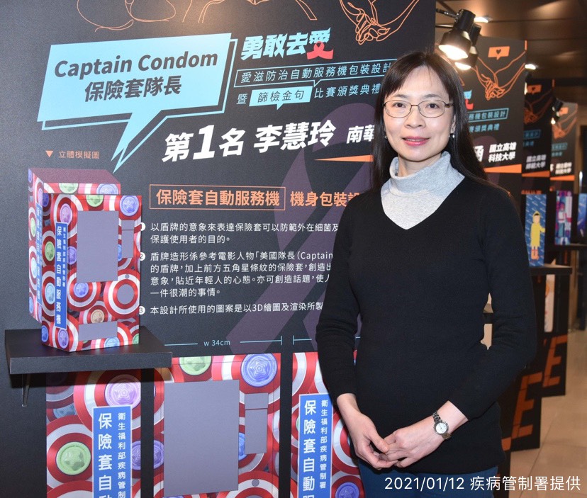 本次比賽由吳茵敏等同學榮獲「愛滋篩檢金句比賽」,運用文字加上押韻技巧,精準展現愛滋匿名篩檢的優點與重要性;有關「保險套自動服務機機身包裝設計比賽」則由南華大學李慧玲同學榮獲第一名,李同學以「Captain Condom(保險套隊長)」為主題,以明亮的色彩,搭配幽默的設計風格,展現面對愛滋病的正向態度。