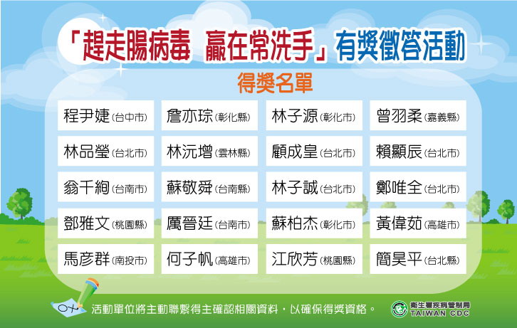 為加強幼童正確洗手觀念,以避免腸病毒的威脅,衛生署疾病管制局自96年5月14日至6月6日止,於國語日報進行為期三週的「趕走腸病毒‧贏在常洗手」防疫有獎徵答活動,共吸引超過六百位的學童參加。6月11日於國語日報報社經理部會議室,在楊律師志文見證下,由國語日報社經理部賴明佶總經理等代表,公開抽出20位幸運學童得獎名單(如附件),將可獲得「小作家月刊」半年份,得獎名單將同步刊登於本(6)月13日的國語日報。