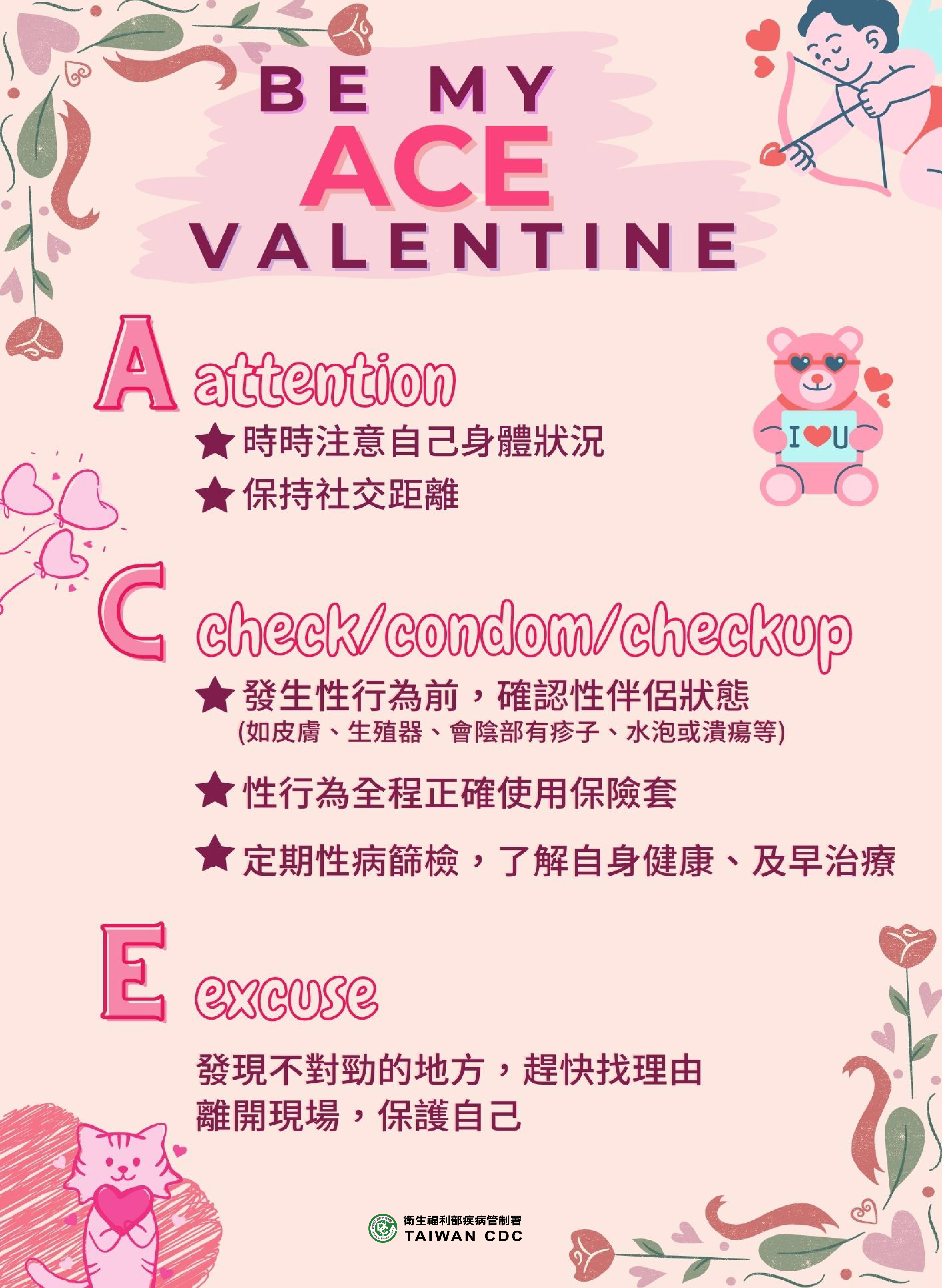 一年一度象徵浪漫愛情的七夕來臨,在大家眼裡的完美情人是什麼樣的?讓疾管署告訴你,「Be my ACE valentine!」完美情人有ACE三招:第一招,A-attention時時注意自己身體狀況,保持社交距離,距離創造美感。第二招,C-check/condom/checkup發生性行為前,確認性伴侶狀態(有無疑似症狀,如皮膚、生殖器、會陰部有疹子、水泡或潰瘍);性行為時依照「看、撕、擠、捏、套、取、丟」7步驟全程使用保險套;定期進行性病篩檢,了解自身健康、及早治療。第三招,E-excuse如果有發現不對勁的地方,相信自己的直覺,趕快找理由離開現場,保護自己。