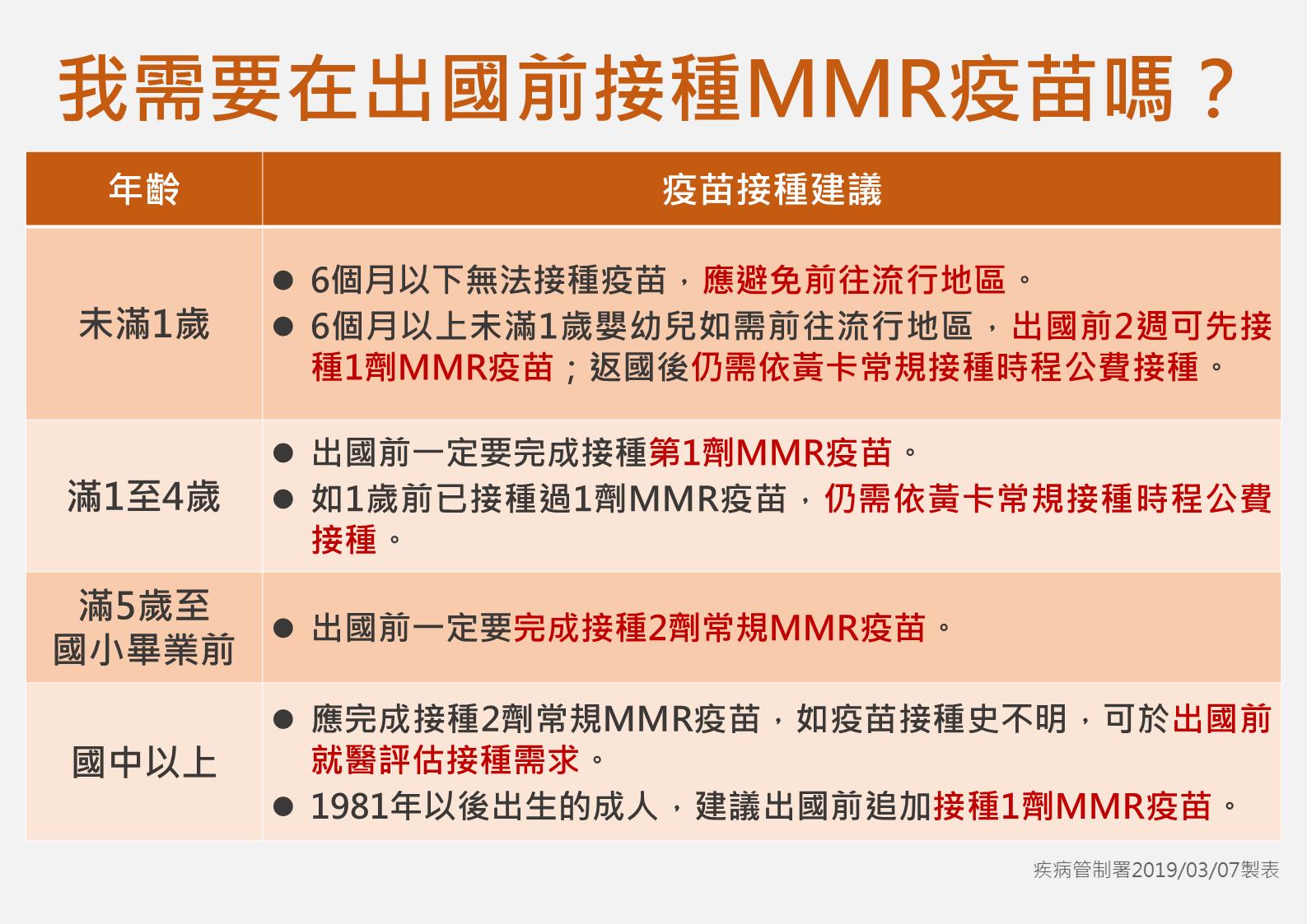 疾管署表示,目前國內6家國籍航空公司之空勤機組人員之麻疹、腮腺炎、德國麻疹混合疫苗(MMR)接種完成率達八成三;另航空器上之乘客如確診麻疹,衛生單位將針對該班機之2歲以下幼兒、與個案座位同排及前後二排之乘客、個案同行旅客及機上所有空服員與機組員等進行接觸者匡列,防疫人員每日會主動追蹤接觸者自主健康管理情形。再次提醒民眾應按時帶幼兒接種MMR疫苗,並避免帶未滿1歲的嬰幼兒至麻疹流行地區;如須攜6個月以上未滿1歲的嬰兒前往,請於出發前自費接種1劑MMR疫苗。1981年以後出生的成人如計劃至流行地區,可於出國前2至4週諮詢評估是否需接種MMR疫苗(如附表)。相關資訊可至疾管署全球資訊網(https://www.cdc.gov.tw),或撥打免付費防疫專線1922(0800-001922)洽詢。
