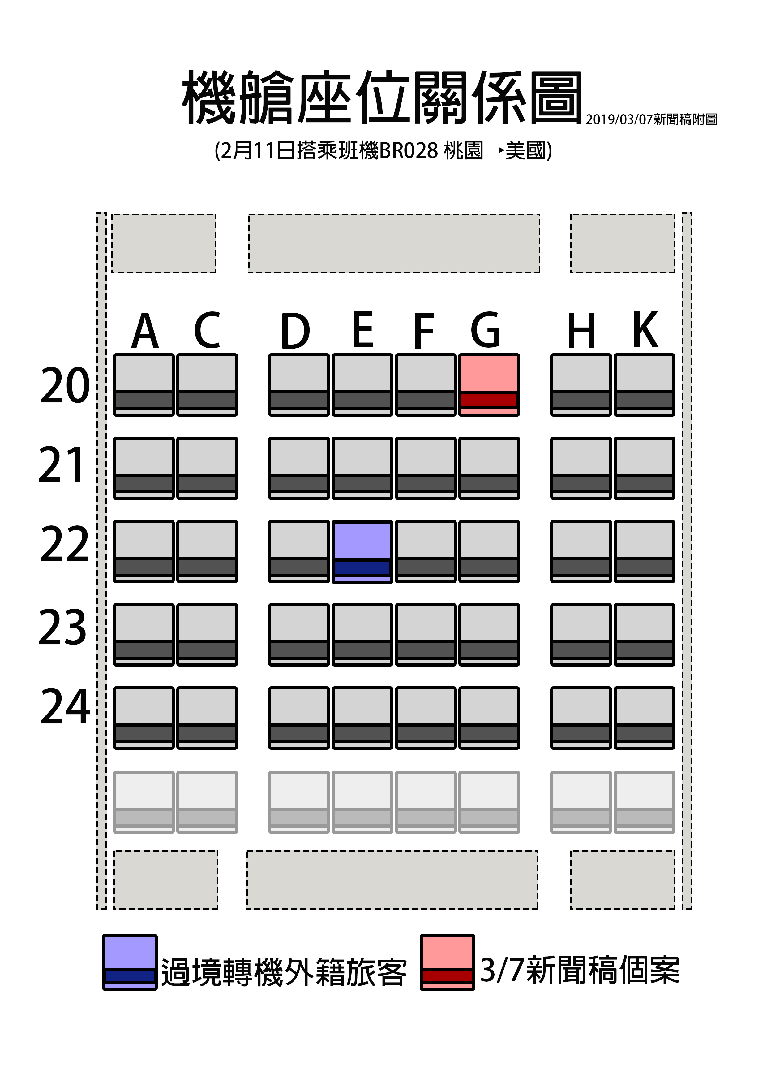 疾病管制署公布國內新增1例麻疹確定病例,北部30多歲本國籍男性2月11日曾搭機由台北桃園至美國舊金山,返國後於3月3日出現出疹症狀,經就醫及採檢於昨(6)日確診。疾管署指出,美國2月20日曾透過國際衛生條例國家窗口(IHR National Focal Point)通知一名外籍旅客確診麻疹,發病後曾搭機由菲律賓馬尼拉經台北桃園轉機前往舊金山,而本次確診個案為該名外籍旅客之同班機鄰近座位乘客(如附圖),研判個案係因搭機過程接觸該名過境外籍旅客感染;個案目前症狀已緩解居家隔離中。