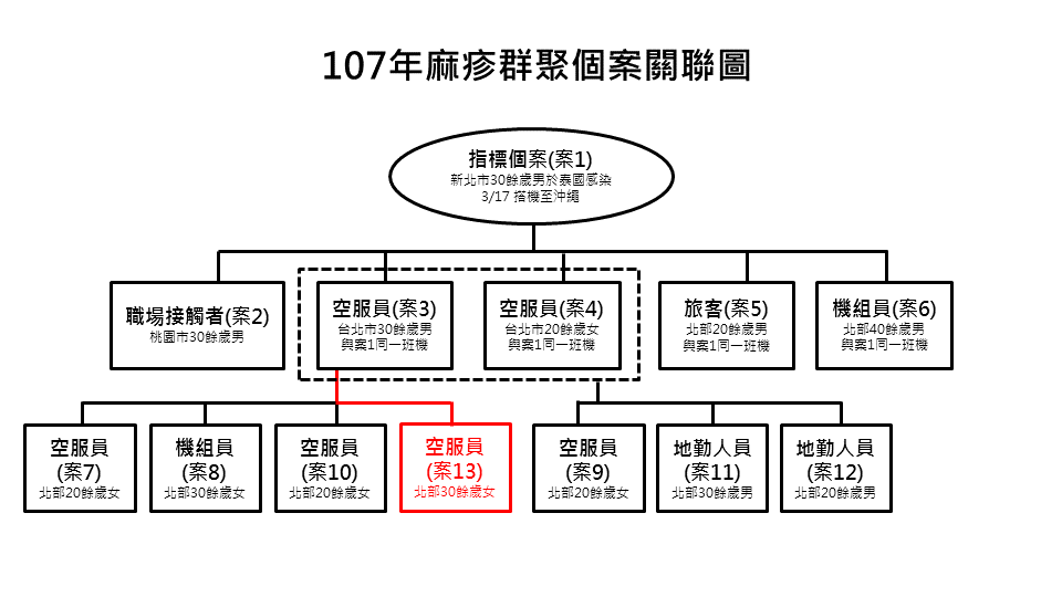 另1例確診個案與此次麻疹群聚感染相關,為原已列為接觸者追蹤之北部30多歲女性空服員(案13),4月7日曾接種MMR疫苗,4月13日發病,經採檢通報於今日確診。由於個案與此群聚已公布之案3有共同辦公室暴露史,故研判屬同一波辦公區域的感染。截至目前此群聚感染包含指標個案共13人確診,衛生單位已掌握接觸者共3,536人,將持續監測至5月7日。民眾如曾與確診個案搭乘相同大眾交通運輸或出入相關公共場所(如附表),請自主健康管理18天(自最後接觸日起算),如出現疑似症狀,請戴口罩儘速就醫並告知接觸史。