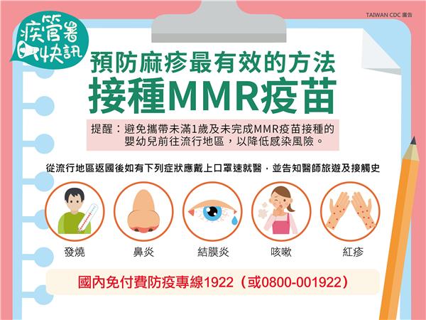 疾管署再次提醒,麻疹傳染力強,民眾應按時帶幼兒接種MMR疫苗,並避免帶未滿1歲或未接種疫苗的幼兒至越南、菲律賓等麻疹流行地區;如須攜6個月以上未滿1歲的嬰兒前往,可於出發前帶幼兒自費接種1劑MMR疫苗;自麻疹流行地區返國後如有疑似症狀,應配戴口罩儘速就醫及告知旅遊史。相關資訊可至疾管署全球資訊網(https://www.cdc.gov.tw),或撥打免付費防疫專線1922(0800-001922)洽詢。