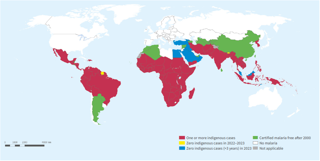 b過去至少連續3年零本土病例的國家視為無瘧疾感染風險。2023年,馬來西亞報告了六年來沒有由瘧原蟲物種引起的本土病例,沙烏地阿拉伯及東帝汶報告了連續3年零本土病例,維德角共和國及貝里斯在2023年被認證為無瘧疾國家,此前有4年報告零瘧疾病例。埃及在2024年被認證為無瘧疾國家。資料來源:世界衛生組織資料庫。