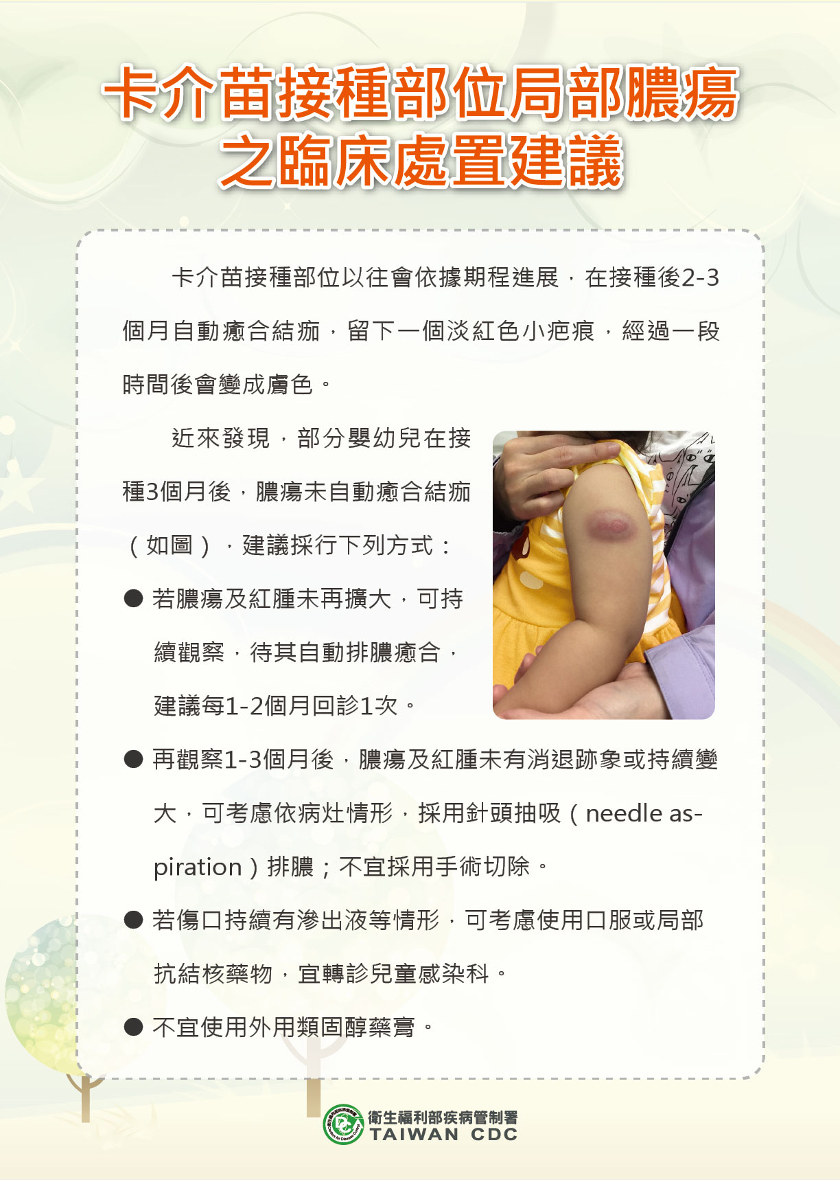 為使家長在接種前瞭解接種後可能出現的情況及其處理方式,疾管署已在「卡介苗接種敬告家長書」中增列:「部分嬰幼兒於接種3個月後,接種部位膿瘍仍未自動癒合結痂,請於下次接種常規疫苗的時間或提前回診,由醫師為您的嬰幼兒作適當的評估與處置。」並放置於疾管署全球資訊網(路徑:首頁 > 傳染病介紹 > 空氣或飛沫傳染 > 結核病)。
