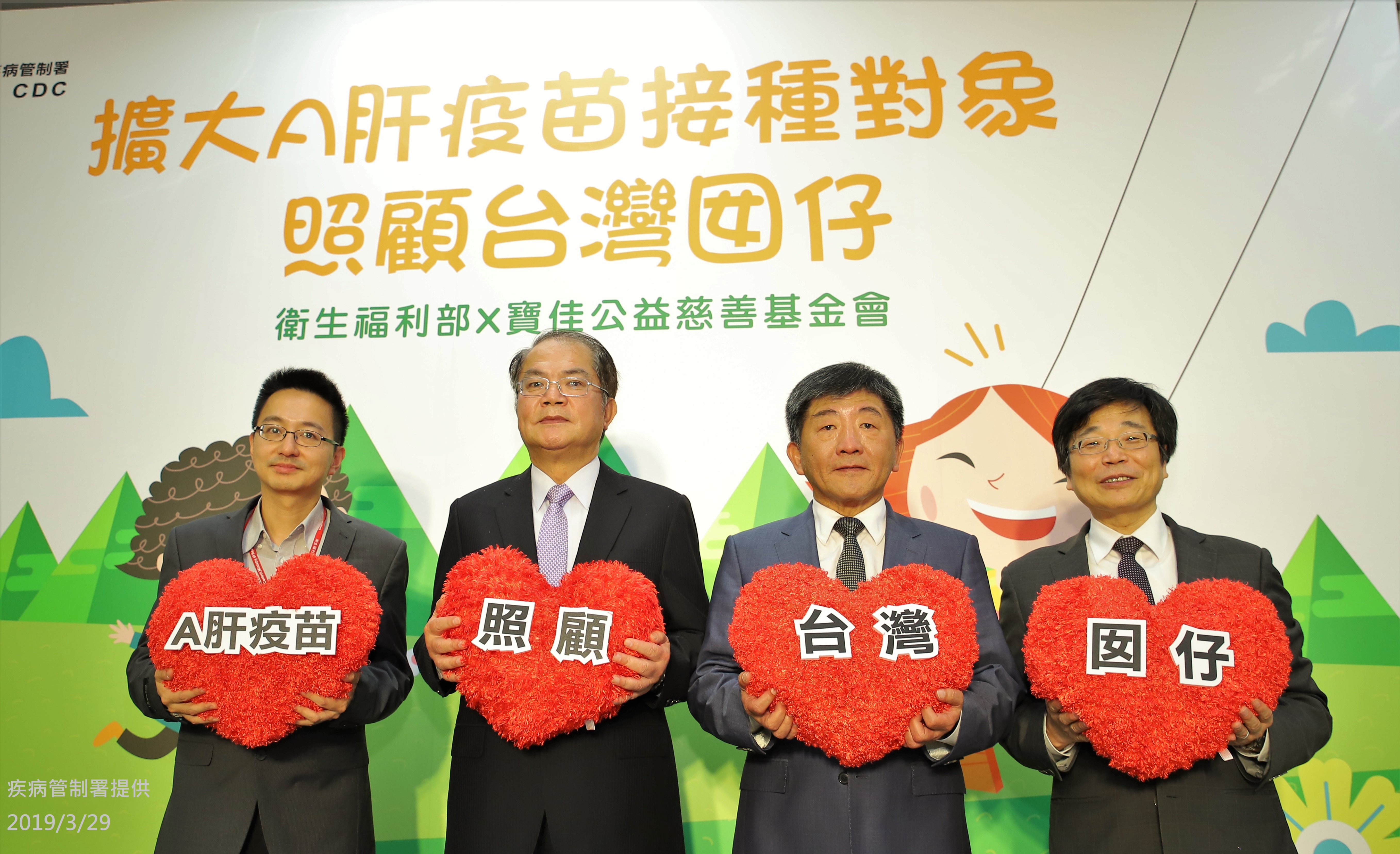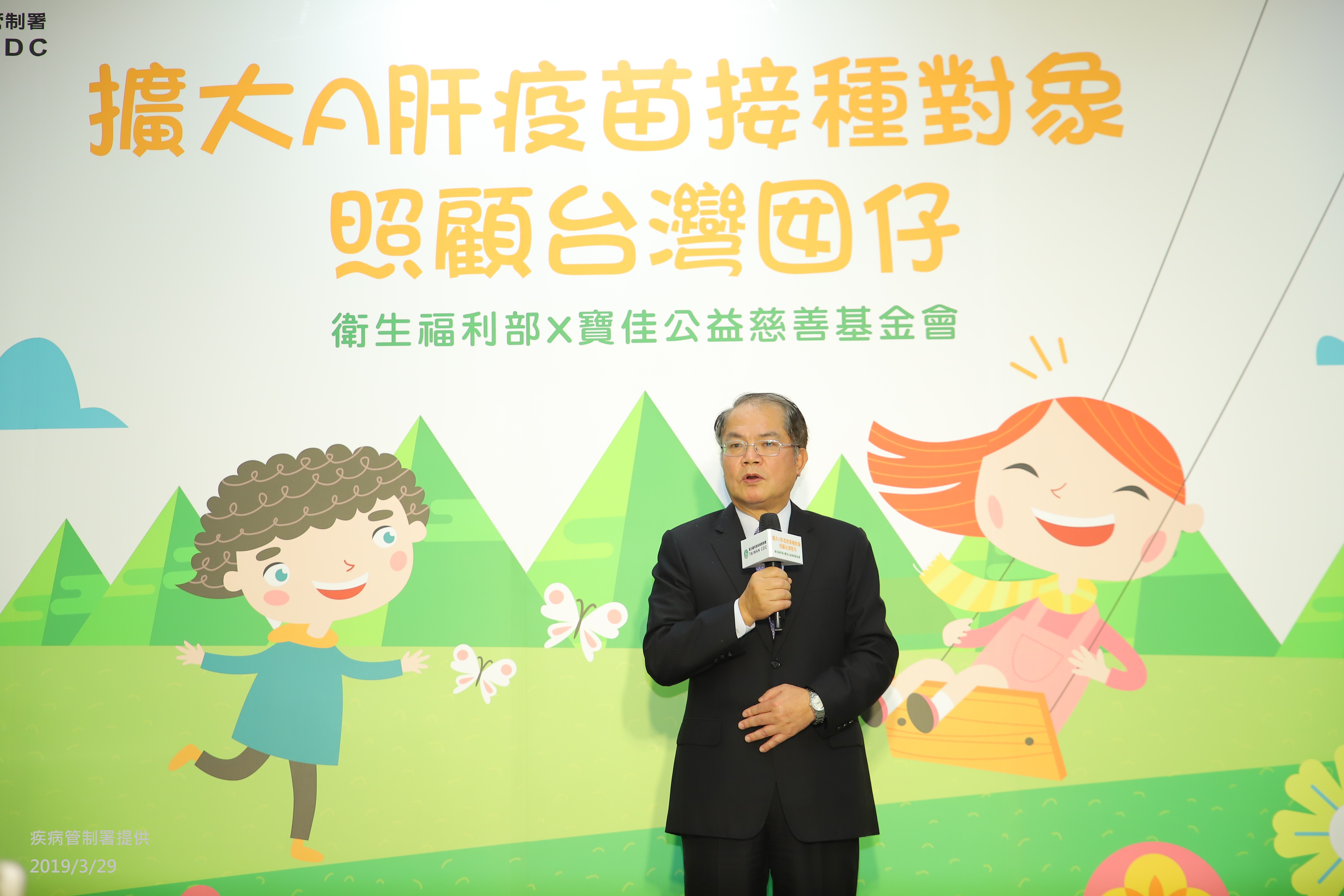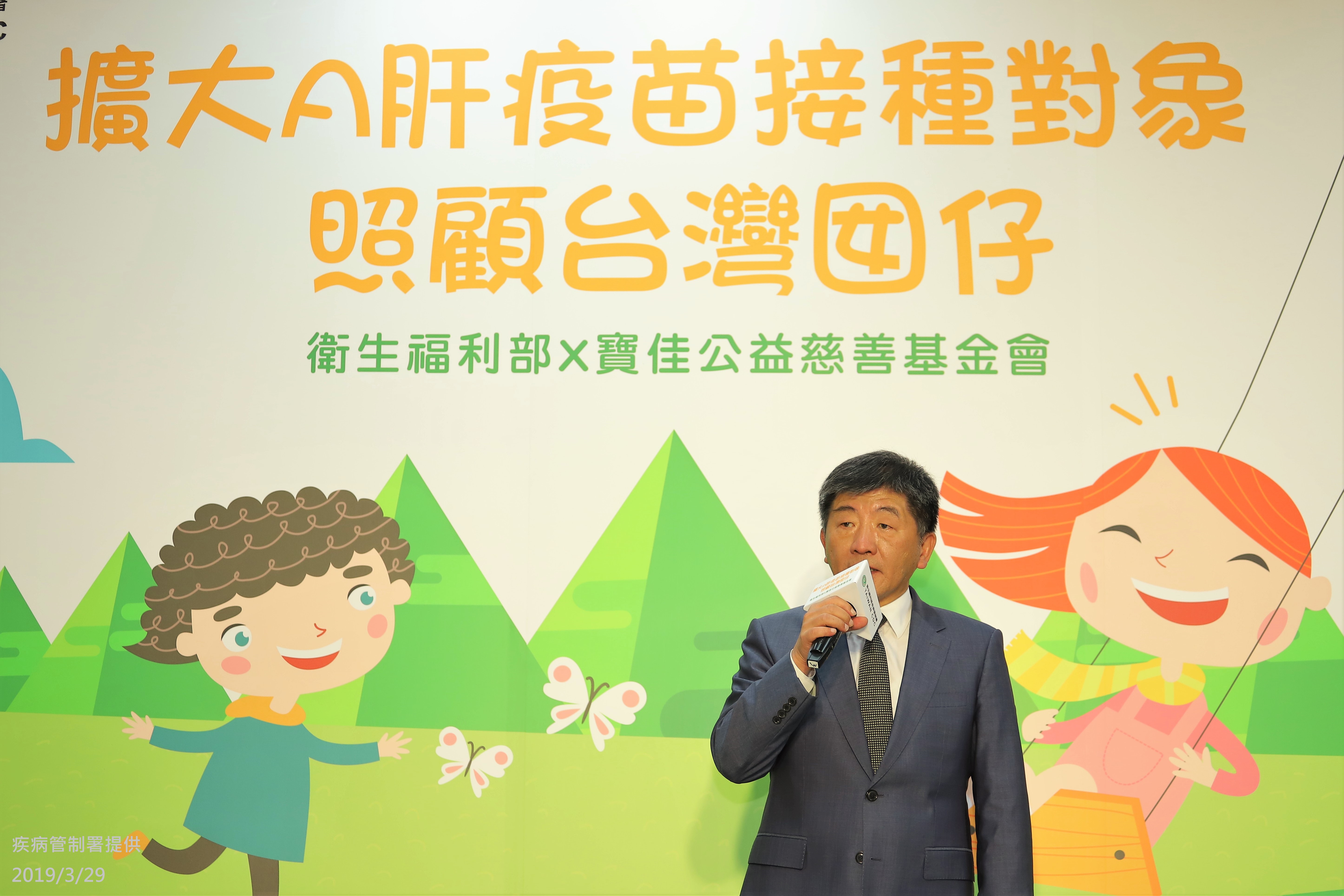 衛福部陳時中部長再次感謝「財團法人寶佳公益慈善基金會」支持預防接種政策,讓衛福部將A型肝炎疫苗自2018年起順利納入幼童常規疫苗接種項目外,今(2019)年更擴大照顧至國內低收及中低收入戶兒童的健康,樹立企業回饋社會楷模,並期望藉由該基金會之拋磚引玉,引領更多企業共襄善舉,與政府共同為國人健康建構良好的基石。