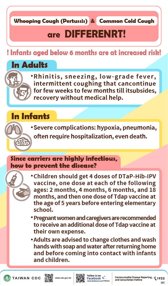 Pertussis occurs worldwide. In recent years, the annual number of confirmed Pertussis cases is about 40 to 90 in Taiwan. Pertussis epidemic occurred in Families, schools, hospitals, child care centers.