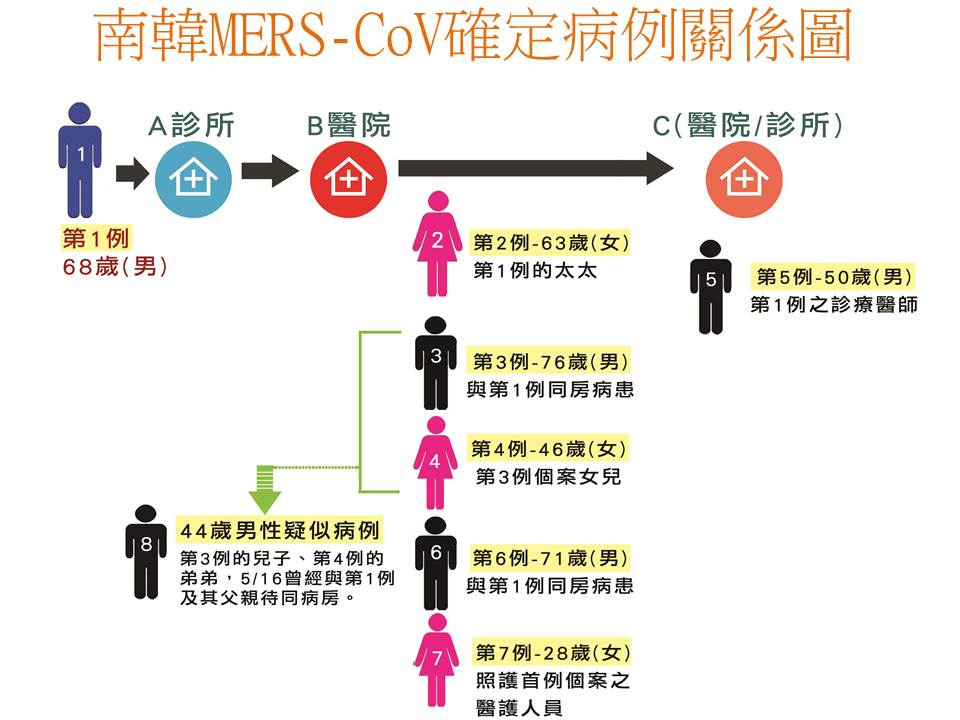 另南韓政府表示,目前有一名44歲男性疑似個案,為第3例確定病例的兒子,曾於5月16日探視其父,5月19日至5月25日間曾出現發燒症狀,5月26日經香港前往中國大陸,現中國大陸已掌握該名疑似個案,且南韓衛生單位亦已掌握該疑似個案之接觸者10人(家人及醫護人員)、同職場180人,及同班機旅客名單,該國持續追蹤接觸者。