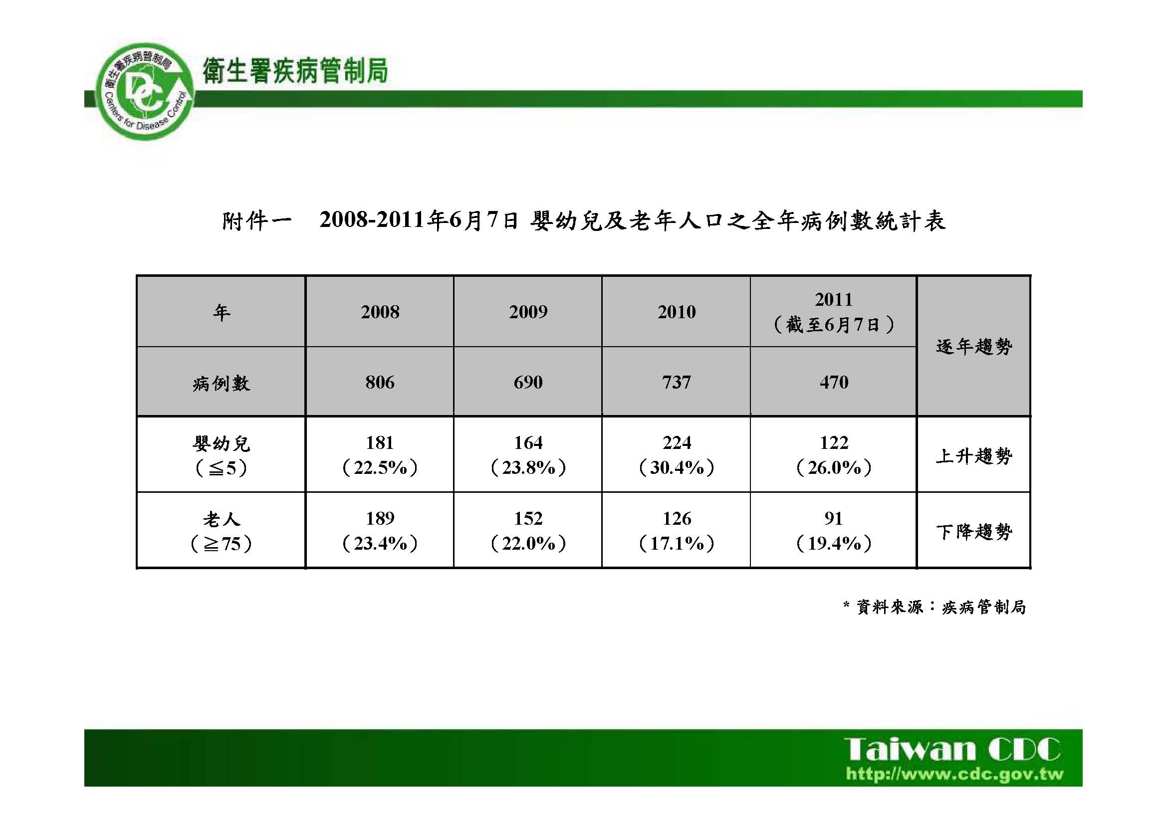 根據本局監視資料,今(2011)年截至6月7日止,國內侵襲性肺炎鏈球菌感染症(IPD)確定病例已達470例,相較過去三年同期病例數(422例、371例、372例)大幅增加。在發生年齡層方面,以幼童及老人為主要感染族群,於過去三年全年病例中,5歲以下嬰幼兒個案約佔22.5%至30.4%,比率逐年增加;至於75歲以上老年個案則佔17.1%至23.4%,呈現下降趨勢。