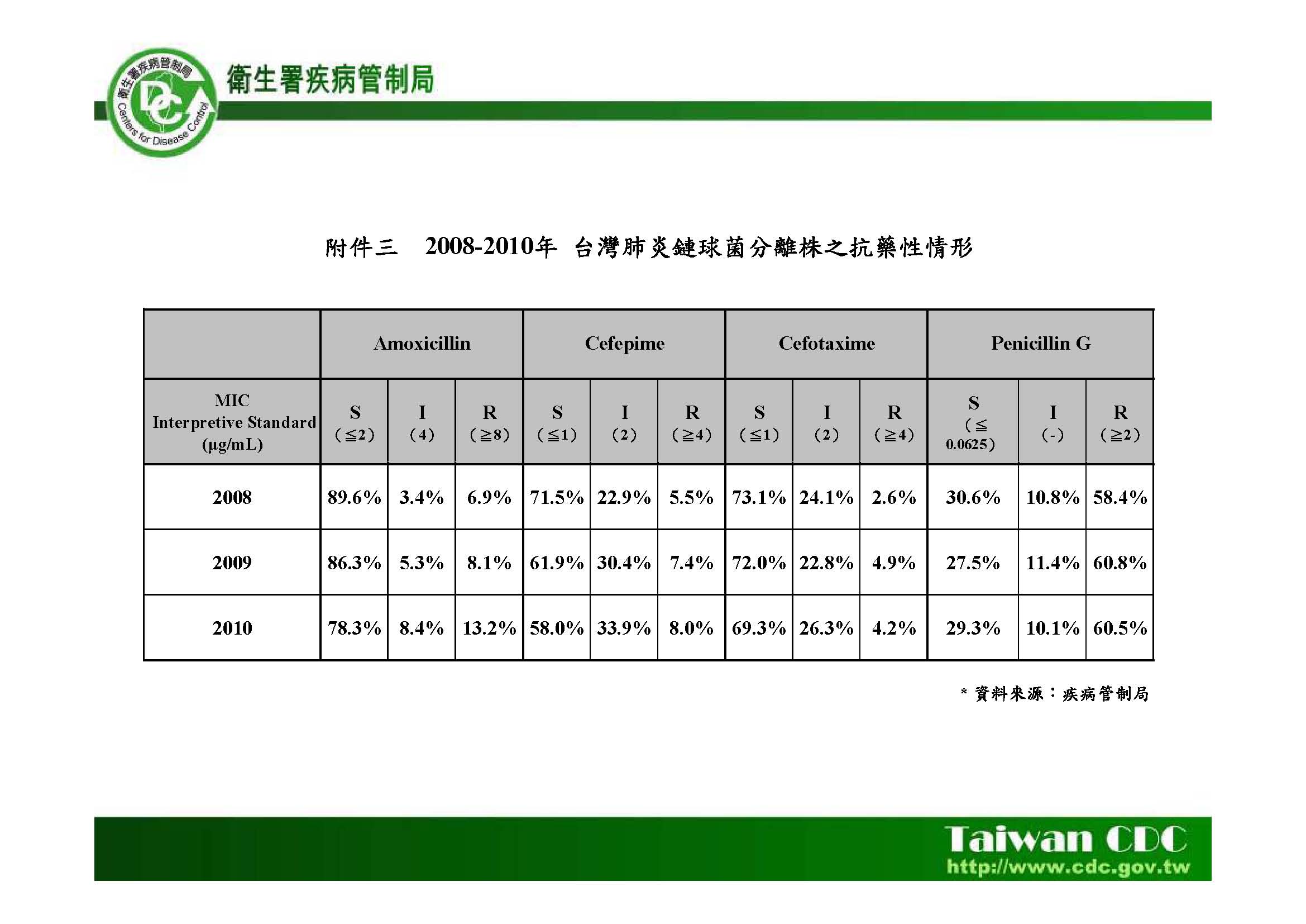 在抗藥性趨勢方面,Penicillin G的抗藥性近年來已提高至6成。至於Cefepime、Cefotaxime以及Amoxicillin等第二線用藥則抗藥性尚不嚴重,以上提供醫界朋友於臨床治療用藥時參考。