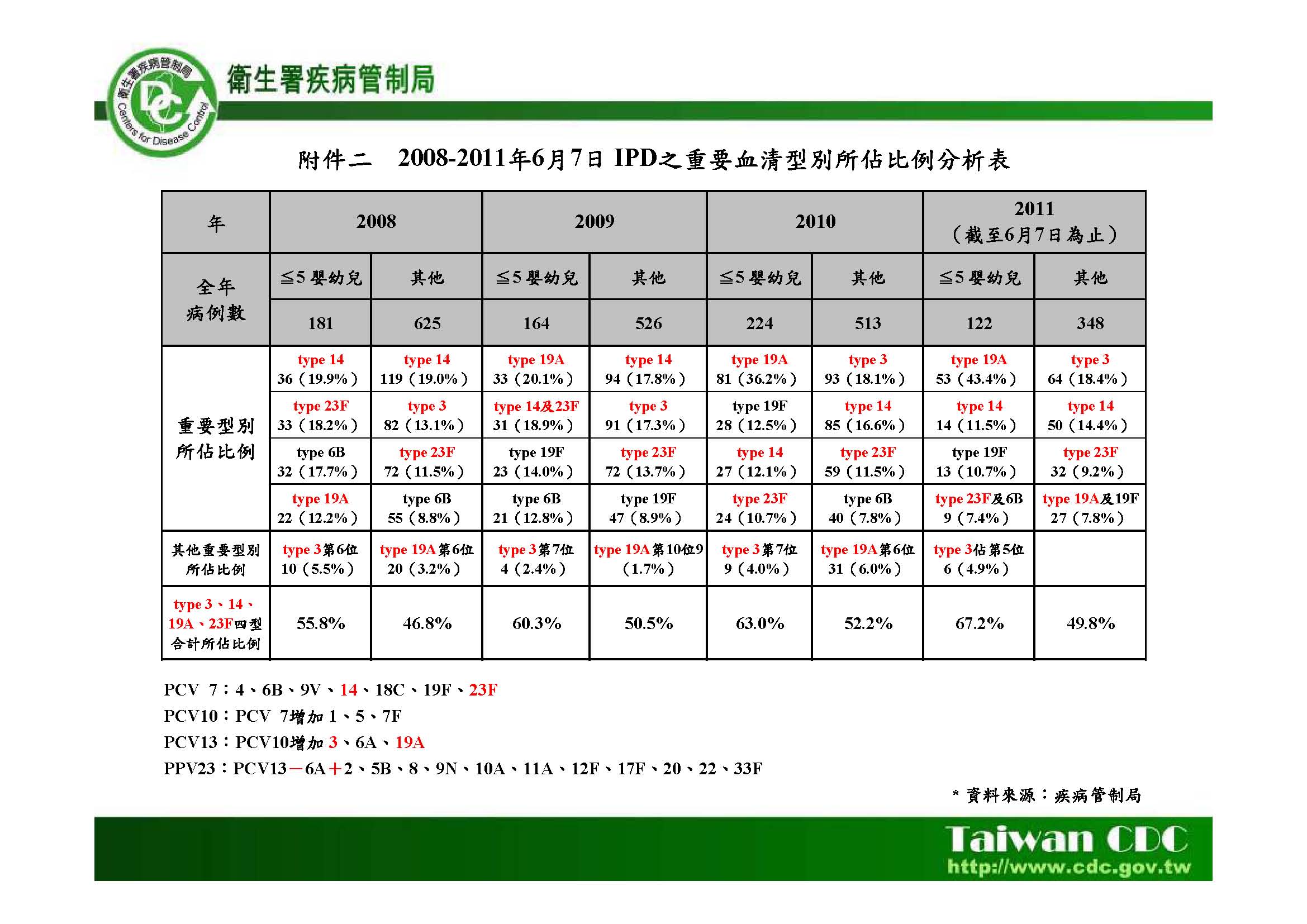 IPD自民國96年納入通報以來,個案之分離株以19A、3、14及23F等四種血清型為主,約佔所有型別總數的5成以上,在防治與臨床治療上佔重要的角色。其中七價肺炎鏈球菌疫苗(PCV7)或十價肺炎鏈球菌疫苗(PCV10)可涵蓋的第14及23F型,所佔比率逐年滑落,可見疫苗接種已收到一定成效。另第3型為超過18歲的成年族群所感染之最重要血清型別;19A則主要為5歲以下的嬰幼兒所感染之最重要血清型別,所佔比率逐年遽增,其具有高侵襲性、高盛行率,而且抗藥性情形也逐年升高。此兩種型別,均為十三價肺炎鏈球菌疫苗(PCV13)或23價肺炎鏈球菌疫苗(PPV23)方能涵蓋。請鼓勵目前符合公費接種條件之幼兒(5歲以下重症高危險群、低收入戶與山地離島地區)家長踴躍攜帶幼兒接種疫苗,75歲以上老人亦可免費接種PPV23,惟診察費必須自付。