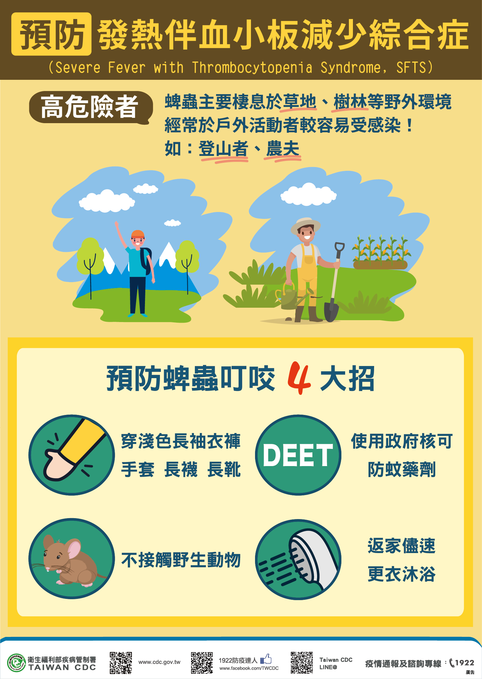 疾管署表示,蜱蟲俗稱「壁蝨」或「八腳怪」,以棲息草叢、樹林等野外環境為主,4月至10月為國內蜱蟲活動季節,蜱蟲可能傳播萊姆病、Q熱、SFTS等疾病,國外亦有蜱蟲隨候鳥遷徙跨境傳播疾病之案例,民眾應注意防蜱叮咬,避免在草地、樹林等環境中長時間坐臥,如需進入這些區域,應著淺色長袖衣褲、手套及長靴等保護性衣物,並將褲管塞進襪子或鞋子裡,衣物及皮膚裸露處可使用政府機關核可含敵避(DEET)或派卡瑞丁(picaridin)的防蚊蟲藥劑。結束戶外活動後應檢查是否遭蜱蟲叮咬或附著,若發現遭蜱蟲叮咬,應使用鑷子夾住蜱蟲的口器,小心將其摘除,避免口器斷裂殘留於體內,並儘快沐浴更衣,以降低感染機會。如出現疑似症狀,應及時就醫並告知暴露史,以利及早診斷與治療。相關資訊可至疾管署全球資訊網(https://www.cdc.gov.tw)或撥打免付費防疫專線1922(或0800-001922)洽詢。