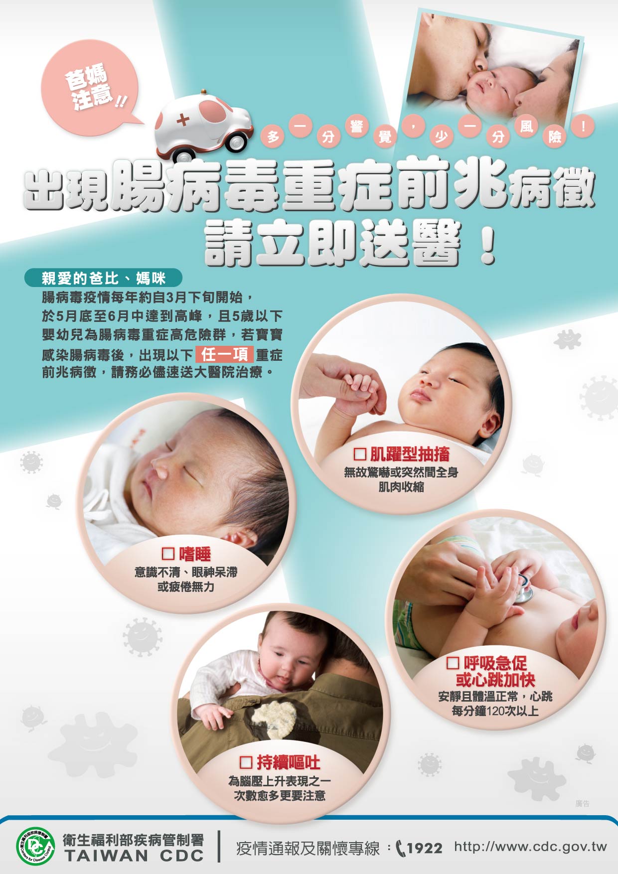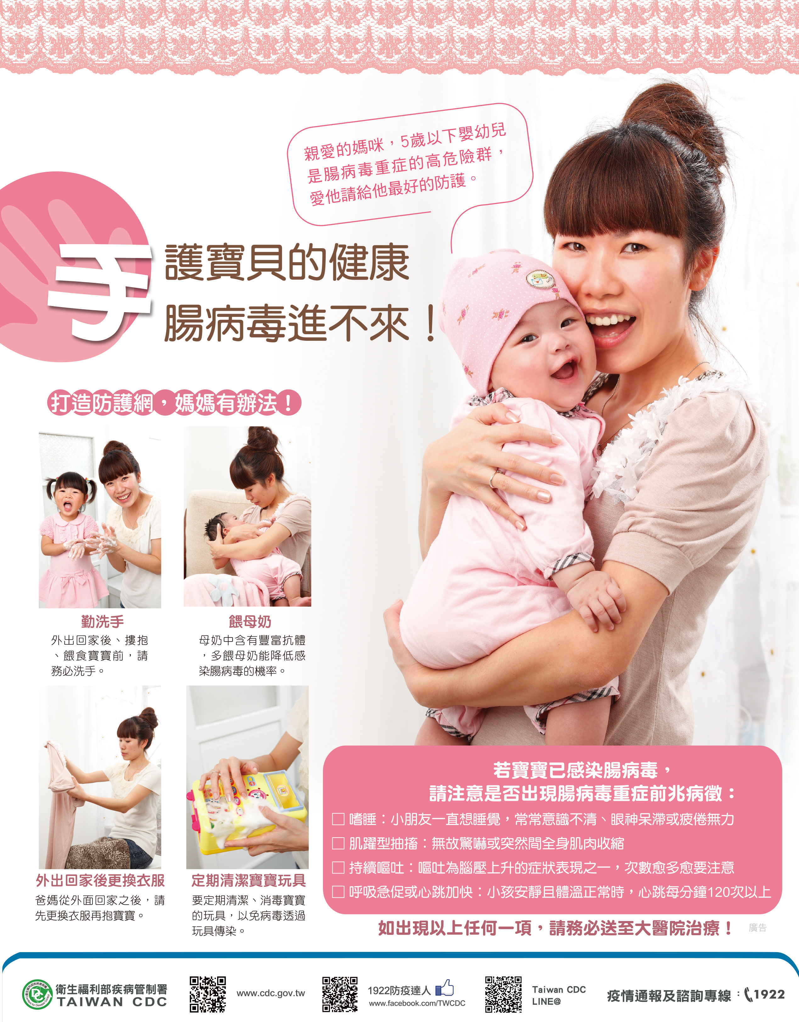 疾管署再次呼籲,腸病毒傳染力極強,部分患者感染腸病毒後僅有類似感冒的輕微症狀,不易察覺及預防而成為潛在傳染源。提醒民眾工作返家務必先更衣、以肥皂洗手後再抱小孩,如帶家中幼童外出,幼童返家或進食前亦需確實用肥皂洗手,以降低感染風險。相關資訊可至疾管署全球資訊網(http://www.cdc.gov.tw)或撥打免付費防疫專線1922(或0800-001922)洽詢。