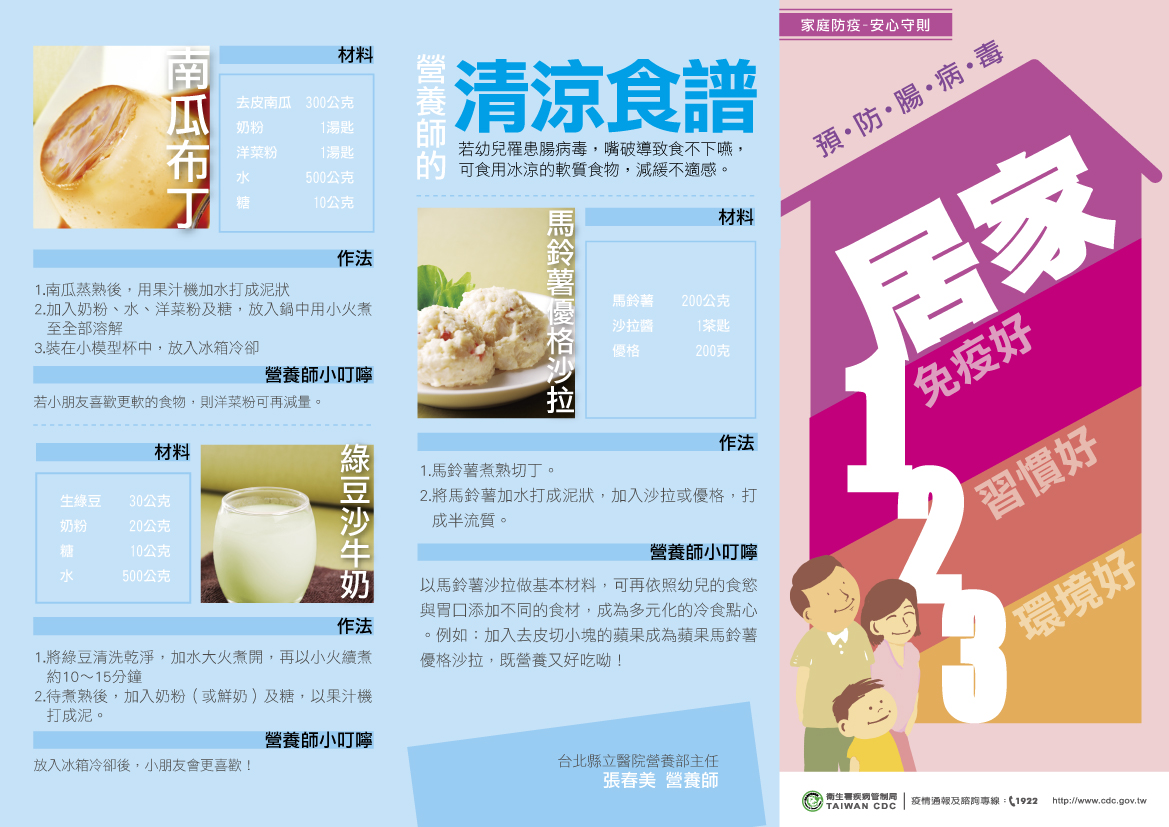 疾管局也為家長設計出一款兼具食譜功能的宣導單張,不只教導家長如何用「居家123」的步驟來預防腸病毒,還請營養師設計「清涼食譜」,當感染腸病毒的幼兒可能因口腔潰瘍而食不下嚥時,這份營養美味的食譜就能派上用場,讓家長不再為準備食物而傷腦筋。